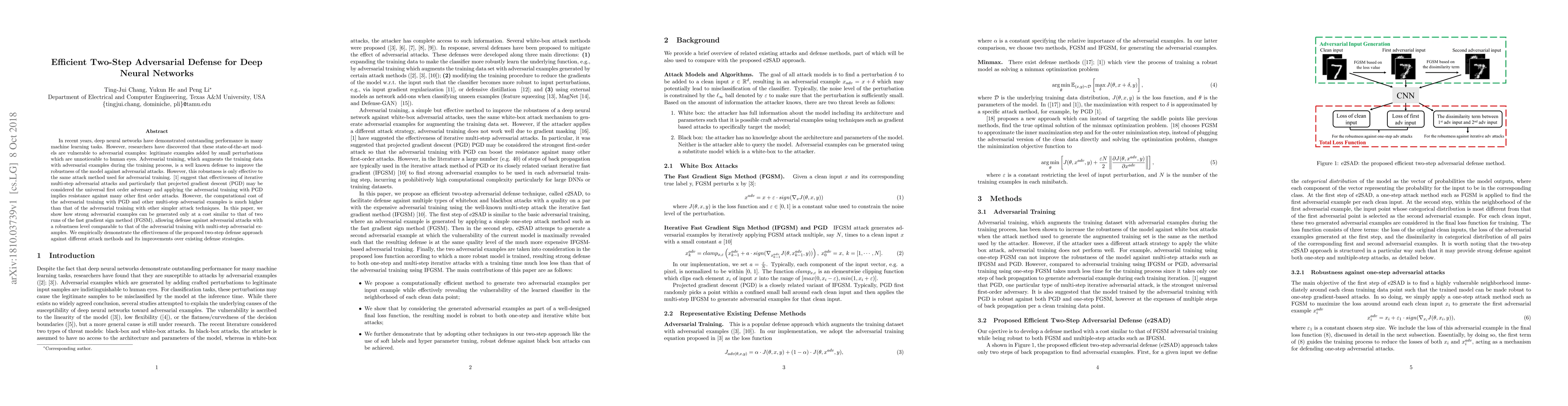This paper proposes an efficient two-step adversarial defense for deep neural networks that generates strong adversarial examples at a cost comparable to two runs of the fast gradient sign method (FGSM), achieving robustness similar to multi-step adversarial training while significantly reducing computational costs. The method is shown to outperform existing defense strategies against various attack methods.