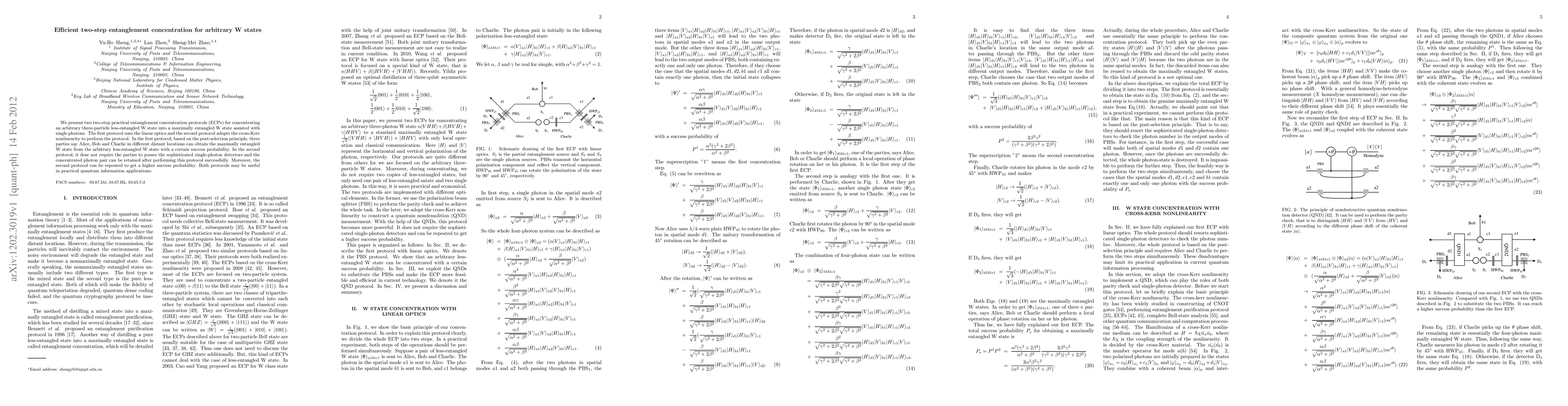 This paper proposes two efficient entanglement concentration protocols for transforming arbitrary three-particle W states into maximally entangled W states using single photons. The first protocol employs linear optics and post-selection, while the second uses cross-Kerr nonlinearity, allowing for repeated use to enhance success probability without requiring sophisticated detectors.
