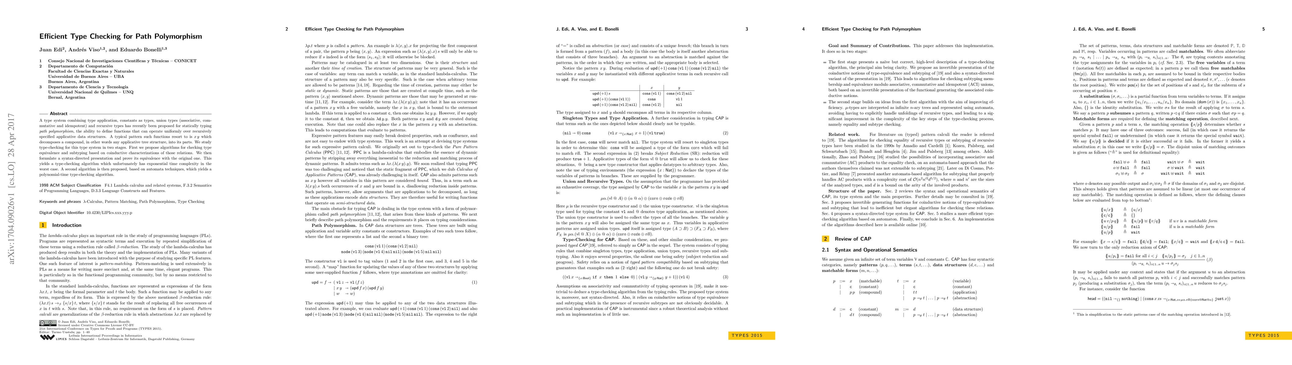 A type system combining type application, constants as types, union types (associative, commutative and idempotent) and recursive types has recently been proposed for statically typing path polymorphism, the ability to define functions that can operate uniformly over recursively specified applicative data structures. A typical pattern such functions resort to is $x\,y$ which decomposes a compound, in other words any applicative tree structure, into its parts. We study type-checking for this type system in two stages. First we propose algorithms for checking type equivalence and subtyping based on coinductive characterizations of those relations. We then formulate a syntax-directed presentation and prove its equivalence with the original one. This yields a type-checking algorithm which unfortunately has exponential time complexity in the worst case. A second algorithm is then proposed, based on automata techniques, which yields a polynomial-time type-checking algorithm.