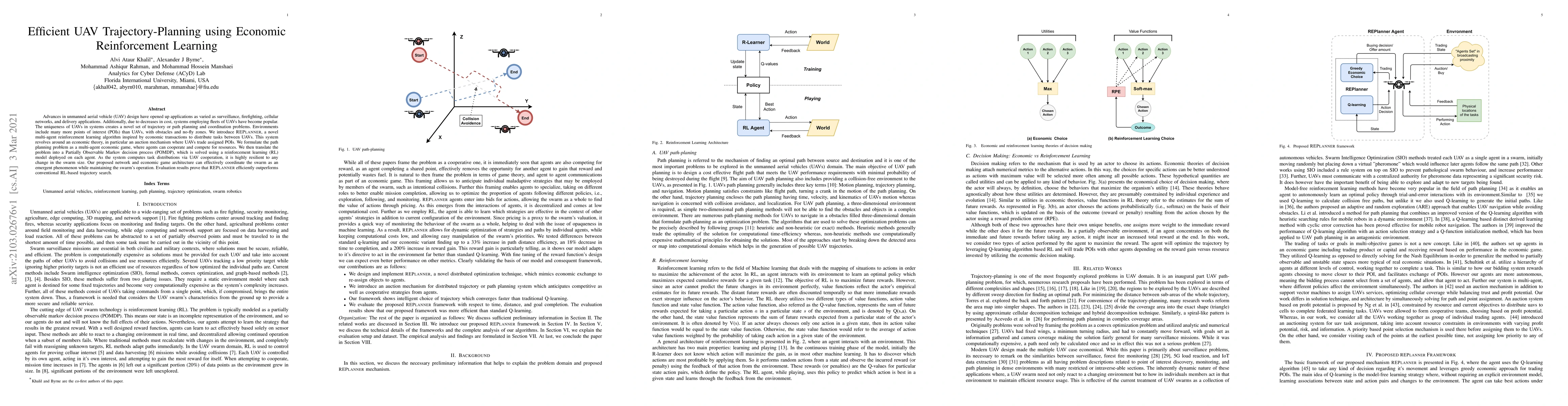 Advances in unmanned aerial vehicle (UAV) design have opened up applications as varied as surveillance, firefighting, cellular networks, and delivery applications. Additionally, due to decreases in cost, systems employing fleets of UAVs have become popular. The uniqueness of UAVs in systems creates a novel set of trajectory or path planning and coordination problems. Environments include many more points of interest (POIs) than UAVs, with obstacles and no-fly zones. We introduce REPlanner, a novel multi-agent reinforcement learning algorithm inspired by economic transactions to distribute tasks between UAVs. This system revolves around an economic theory, in particular an auction mechanism where UAVs trade assigned POIs. We formulate the path planning problem as a multi-agent economic game, where agents can cooperate and compete for resources. We then translate the problem into a Partially Observable Markov decision process (POMDP), which is solved using a reinforcement learning (RL) model deployed on each agent. As the system computes task distributions via UAV cooperation, it is highly resilient to any change in the swarm size. Our proposed network and economic game architecture can effectively coordinate the swarm as an emergent phenomenon while maintaining the swarm's operation. Evaluation results prove that REPlanner efficiently outperforms conventional RL-based trajectory search.