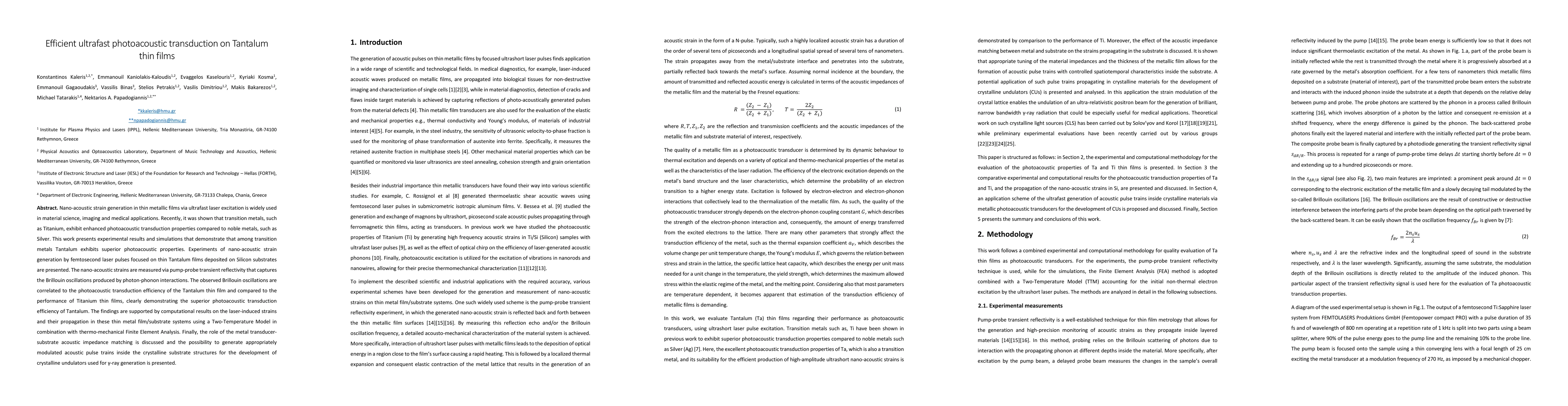 Nano-acoustic strain generation in thin metallic films via ultrafast laser excitation is widely used in material science, imaging and medical applications. Recently, it was shown that transition metals, such as Titanium, exhibit enhanced photoacoustic transduction properties compared to noble metals, such as Silver. This work presents experimental results and simulations that demonstrate that among transition metals Tantalum exhibits superior photoacoustic properties. Experiments of nano-acoustic strain generation by femtosecond laser pulses focused on thin Tantalum films deposited on Silicon substrates are presented. The nano-acoustic strains are measured via pump-probe transient reflectivity that captures the Brillouin oscillations produced by photon-phonon interactions. The observed Brillouin oscillations are correlated to the photoacoustic transduction efficiency of the Tantalum thin film and compared to the performance of Titanium thin films, clearly demonstrating the superior photoacoustic transduction efficiency of Tantalum. The findings are supported by computational results on the laser-induced strains and their propagation in these thin metal film/substrate systems using a Two-Temperature Model in combination with thermo-mechanical Finite Element Analysis. Finally, the role of the metal transducer-substrate acoustic impedance matching is discussed and the possibility to generate appropriately modulated acoustic pulse trains inside the crystalline substrate structures for the development of crystalline undulators used for {\gamma}-ray generation is presented.