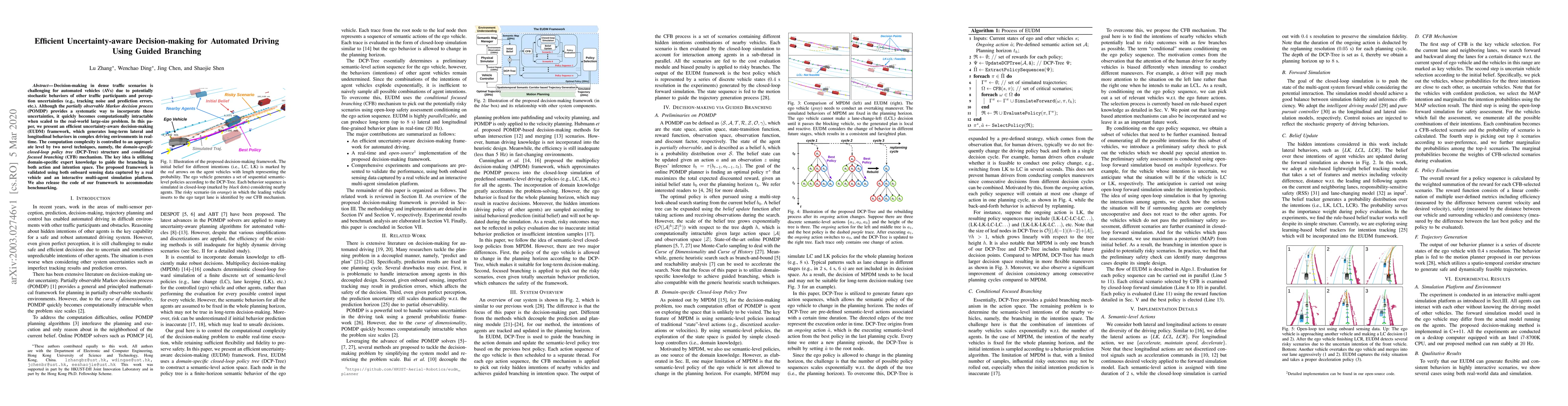 This paper proposes an efficient uncertainty-aware decision-making framework (EUDM) for automated vehicles using guided branching techniques, specifically the DCP-Tree structure and CFB mechanism, to manage computational complexity in dense traffic scenarios. The framework is validated with real-world data and simulation, and the code is released for benchmarking.