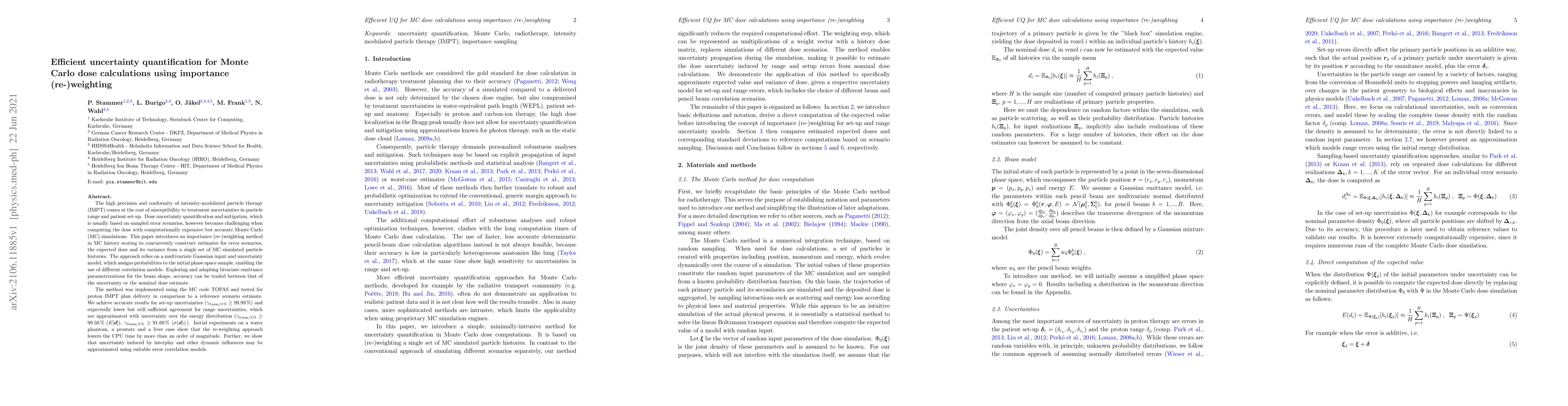 This paper introduces an importance (re-)weighting method for Monte Carlo simulations to efficiently quantify uncertainties in intensity-modulated particle therapy. The method concurrently estimates error scenarios, expected dose, and variance from a single set of simulated particle histories, significantly reducing computational time.