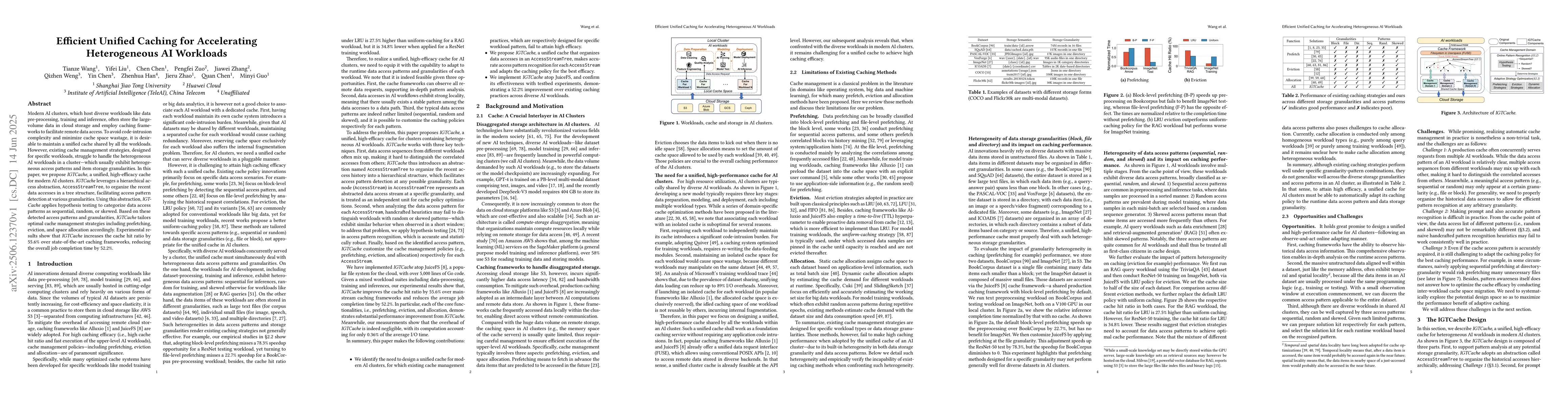Modern AI clusters, which host diverse workloads like data pre-processing, training and inference, often store the large-volume data in cloud storage and employ caching frameworks to facilitate remote data access. To avoid code-intrusion complexity and minimize cache space wastage, it is desirable to maintain a unified cache shared by all the workloads. However, existing cache management strategies, designed for specific workloads, struggle to handle the heterogeneous AI workloads in a cluster -- which usually exhibit heterogeneous access patterns and item storage granularities. In this paper, we propose IGTCache, a unified, high-efficacy cache for modern AI clusters. IGTCache leverages a hierarchical access abstraction, AccessStreamTree, to organize the recent data accesses in a tree structure, facilitating access pattern detection at various granularities. Using this abstraction, IGTCache applies hypothesis testing to categorize data access patterns as sequential, random, or skewed. Based on these detected access patterns and granularities, IGTCache tailors optimal cache management strategies including prefetching, eviction, and space allocation accordingly. Experimental results show that IGTCache increases the cache hit ratio by 55.6% over state-of-the-art caching frameworks, reducing the overall job completion time by 52.2%.