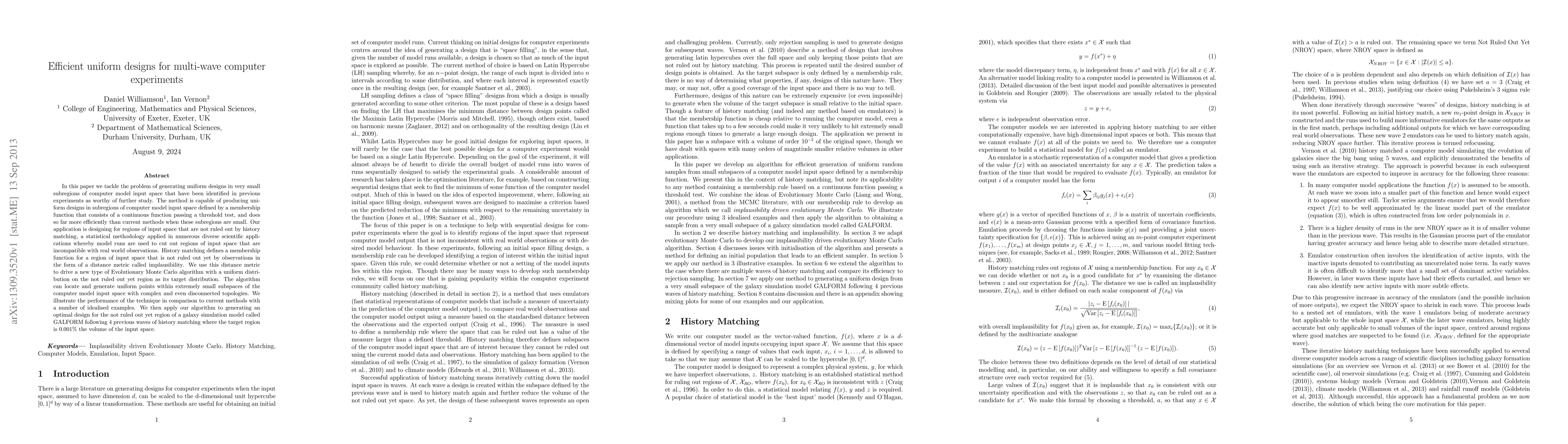 In this paper we tackle the problem of generating uniform designs in very small subregions of computer model input space that have been identified in previous experiments as worthy of further study. The method is capable of producing uniform designs in subregions of computer model input space defined by a membership function that consists of a continuous function passing a threshold test, and does so far more efficiently than current methods when these subregions are small. Our application is designing for regions of input space that are not ruled out by history matching, a statistical methodology applied in numerous diverse scientific applications whereby model runs are used to cut out regions of input space that are incompatible with real world observations. History matching defines a membership function for a region of input space that is not ruled out yet by observations in the form of a distance metric called implausibility. We use this distance metric to drive a new type of Evolutionary Monte Carlo algorithm with a uniform distribution on the not ruled out yet region as its target distribution. The algorithm can locate and generate uniform points within extremely small subspaces of the computer model input space with complex and even disconnected topologies. We illustrate the performance of the technique in comparison to current methods with a number of idealised examples. We then apply our algorithm to generating an optimal design for the not ruled out yet region of a galaxy simulation model called GALFORM following 4 previous waves of history matching where the target region is 0.001% the volume of the input space.