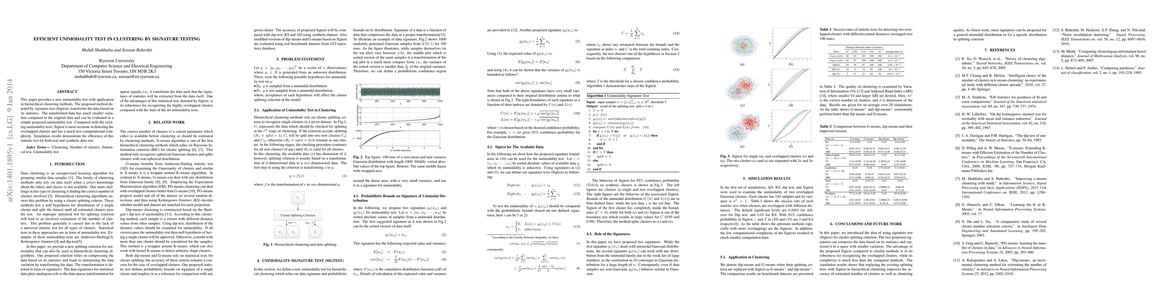 A new unimodality test called signature testing (Sigtest) is proposed for hierarchical clustering methods, offering improved accuracy and reduced computational complexity compared to existing tests.