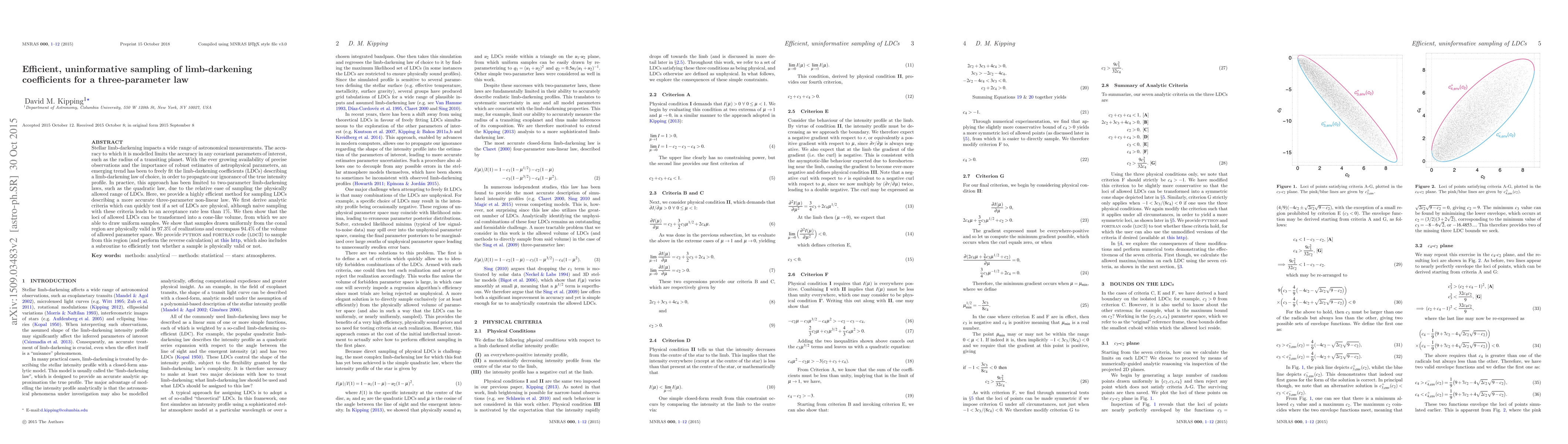 This paper presents an efficient method for sampling limb-darkening coefficients (LDCs) for a three-parameter non-linear law, addressing the challenge of accurately modeling stellar limb-darkening. The method transforms the loci of allowed LDCs into a cone-like volume, enabling uniform sampling with a high acceptance rate and encompassing most of the valid parameter space.