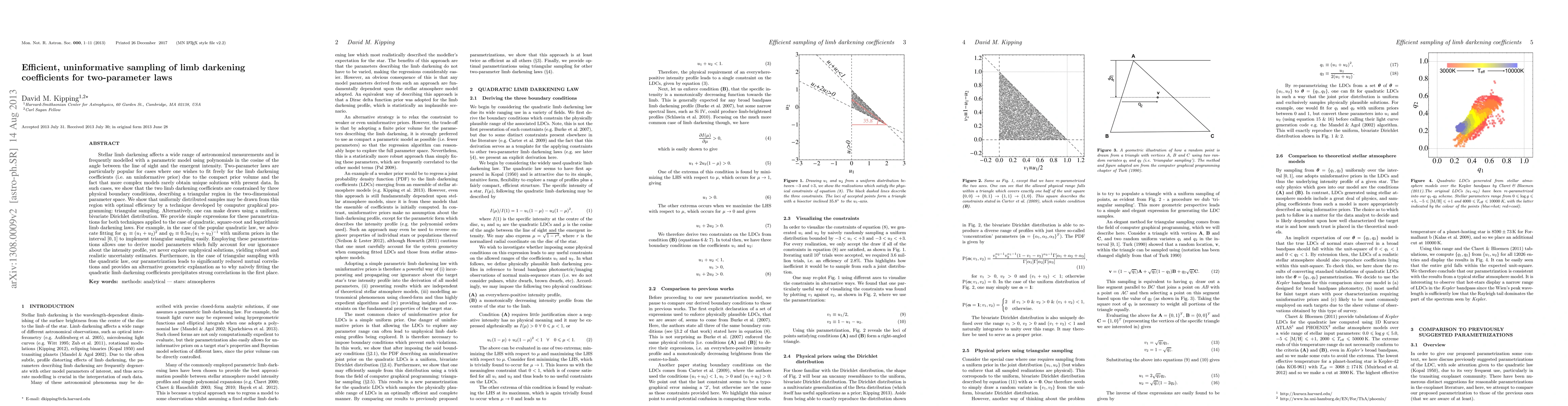 This paper presents efficient methods for sampling limb darkening coefficients under two-parameter laws, focusing on uninformative priors. It introduces triangular sampling and uniform bivariate Dirichlet distribution techniques to uniformly sample within the constrained triangular region defined by physical boundary conditions, ensuring robust and realistic uncertainty estimates while avoiding unphysical solutions.