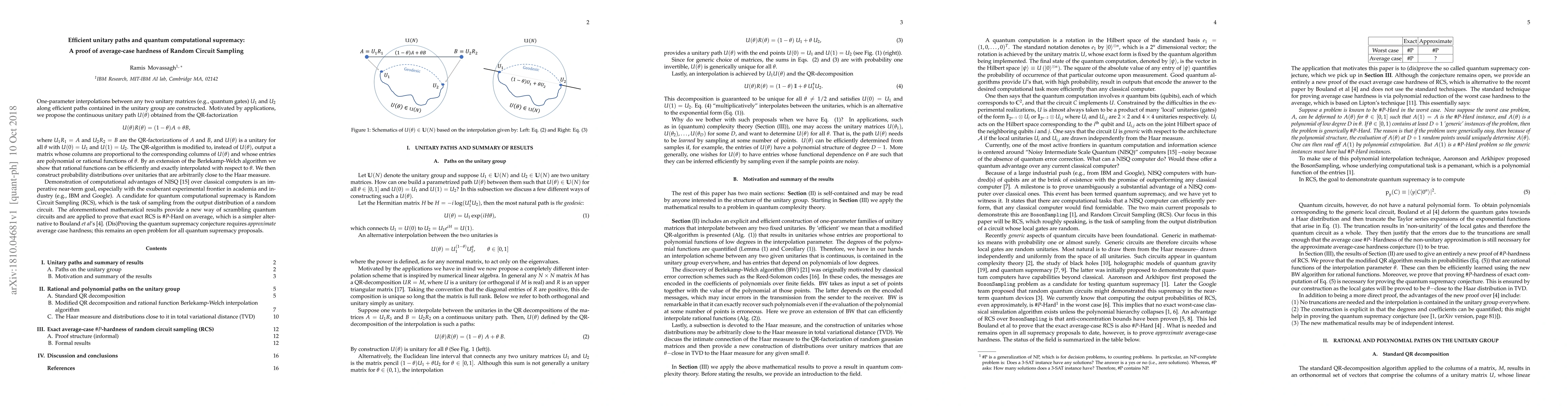 One-parameter interpolations between any two unitary matrices (e.g., quantum gates) $U_1$ and $U_2$ along efficient paths contained in the unitary group are constructed. Motivated by applications, we propose the continuous unitary path $U(\theta)$ obtained from the QR-factorization \[ U(\theta)R(\theta)=(1-\theta)A+\theta B, \] where $U_1 R_1=A$ and $U_2 R_2=B$ are the QR-factorizations of $A$ and $B$, and $U(\theta)$ is a unitary for all $\theta$ with $U(0)=U_1$ and $U(1)=U_2$. The QR-algorithm is modified to, instead of $U(\theta)$, output a matrix whose columns are proportional to the corresponding columns of $U(\theta)$ and whose entries are polynomial or rational functions of $\theta$. By an extension of the Berlekamp-Welch algorithm we show that rational functions can be efficiently and exactly interpolated with respect to $\theta$. We then construct probability distributions over unitaries that are arbitrarily close to the Haar measure. Demonstration of computational advantages of NISQ over classical computers is an imperative near-term goal, especially with the exuberant experimental frontier in academia and industry (e.g., IBM and Google). A candidate for quantum computational supremacy is Random Circuit Sampling (RCS), which is the task of sampling from the output distribution of a random circuit. The aforementioned mathematical results provide a new way of scrambling quantum circuits and are applied to prove that exact RCS is $\#P$-Hard on average, which is a simpler alternative to Bouland et al's. (Dis)Proving the quantum supremacy conjecture requires "approximate" average case hardness; this remains an open problem for all quantum supremacy proposals.
