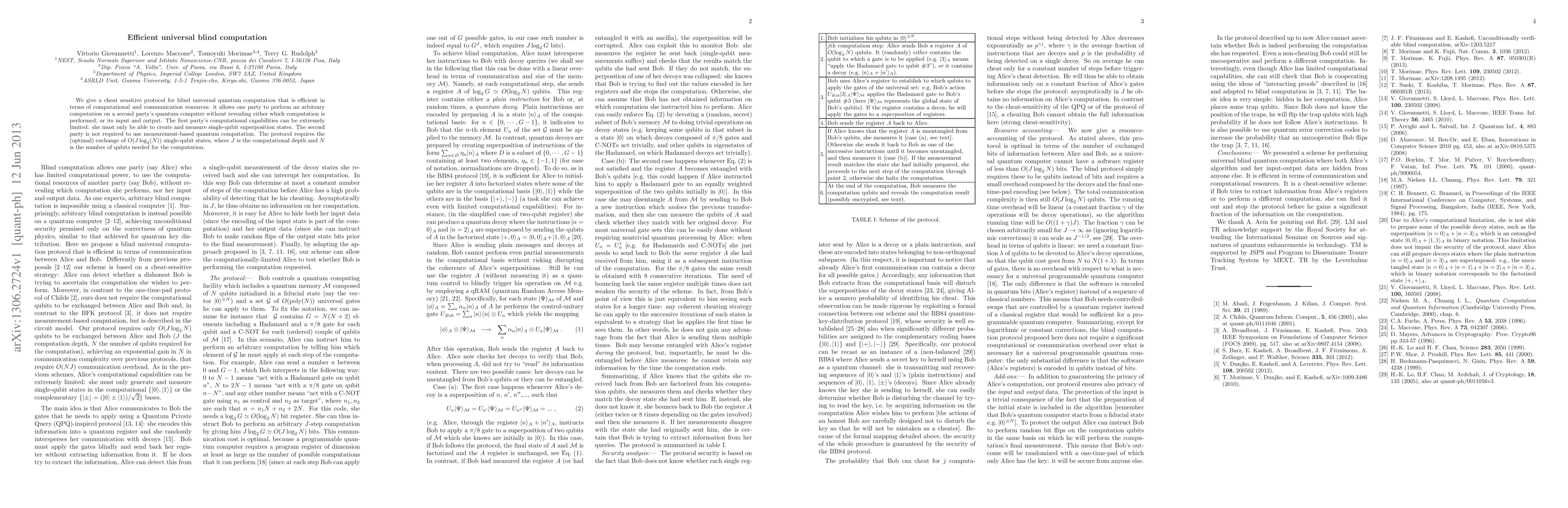 The paper proposes an efficient, cheat-sensitive protocol for blind universal quantum computation that requires minimal first-party capabilities and optimal resource exchange for computation and communication, ensuring neither computation details nor inputs/outputs are revealed. The protocol uses O(J log(N)) single-qubit exchanges, where J is the depth and N is the number of qubits.