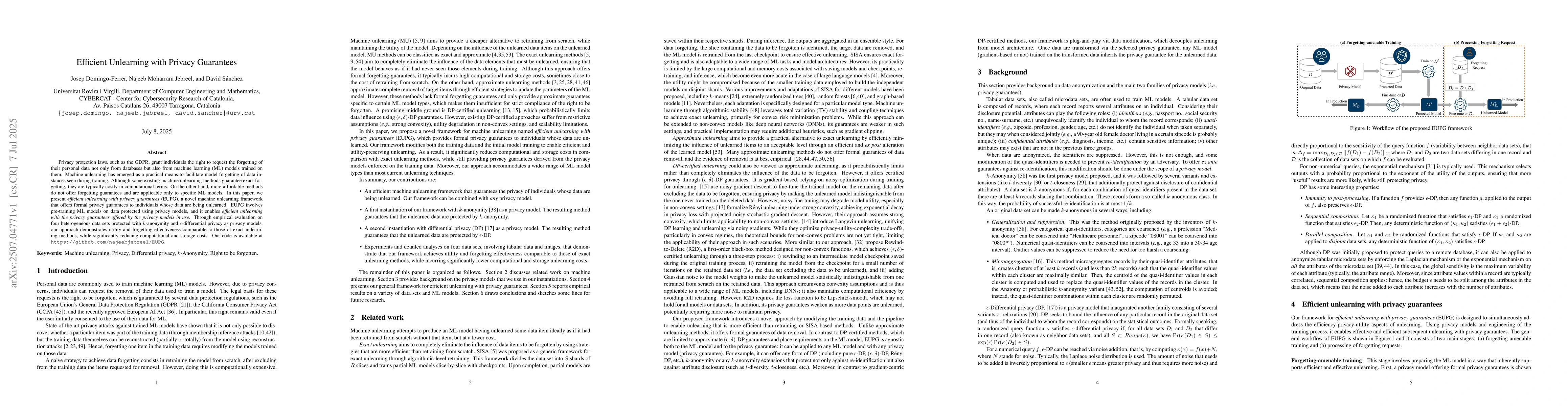 Privacy protection laws, such as the GDPR, grant individuals the right to request the forgetting of their personal data not only from databases but also from machine learning (ML) models trained on them. Machine unlearning has emerged as a practical means to facilitate model forgetting of data instances seen during training. Although some existing machine unlearning methods guarantee exact forgetting, they are typically costly in computational terms. On the other hand, more affordable methods do not offer forgetting guarantees and are applicable only to specific ML models. In this paper, we present \emph{efficient unlearning with privacy guarantees} (EUPG), a novel machine unlearning framework that offers formal privacy guarantees to individuals whose data are being unlearned. EUPG involves pre-training ML models on data protected using privacy models, and it enables {\em efficient unlearning with the privacy guarantees offered by the privacy models in use}. Through empirical evaluation on four heterogeneous data sets protected with $k$-anonymity and $\epsilon$-differential privacy as privacy models, our approach demonstrates utility and forgetting effectiveness comparable to those of exact unlearning methods, while significantly reducing computational and storage costs. Our code is available at https://github.com/najeebjebreel/EUPG.