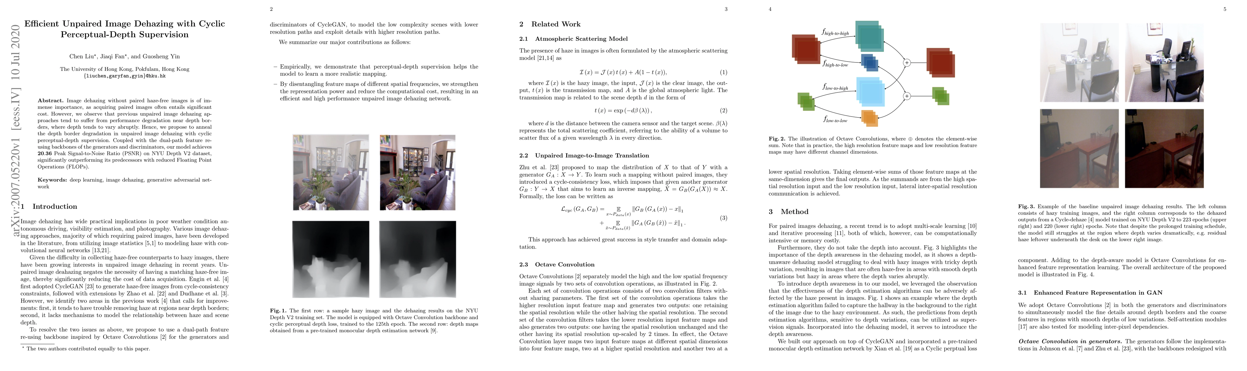 This paper proposes an efficient unpaired image dehazing method using cyclic perceptual-depth supervision to mitigate performance degradation near depth borders. The model, with dual-path feature re-using backbones, achieves a PSNR of 20.36 on the NYU Depth V2 dataset, significantly outperforming previous methods with lower computational costs.