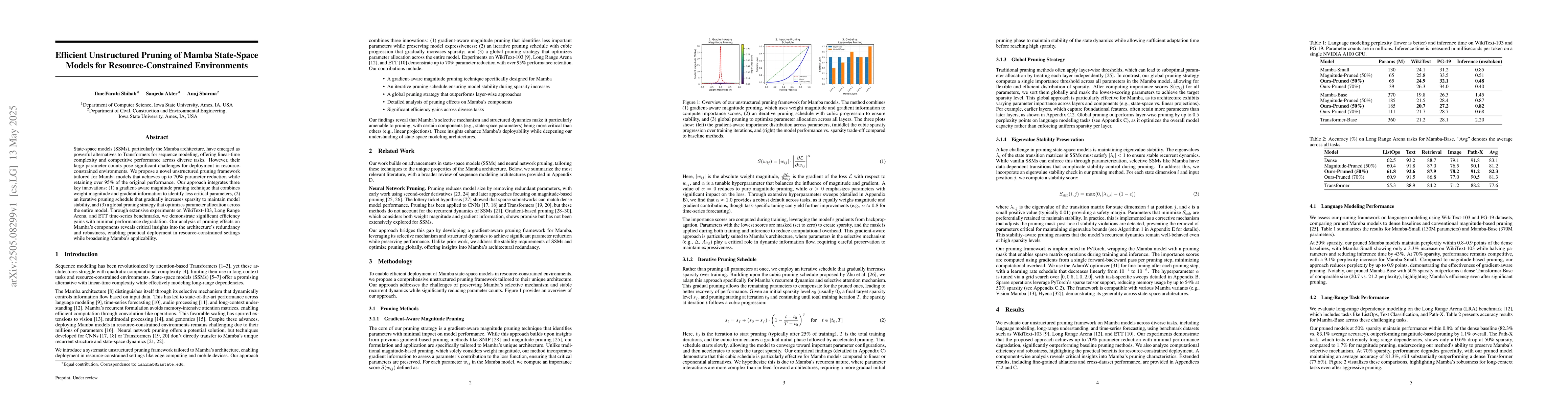 Researchers developed a pruning framework for Mamba state-space models that reduces parameters by 70% without significant performance loss, enabling deployment in resource-constrained environments.