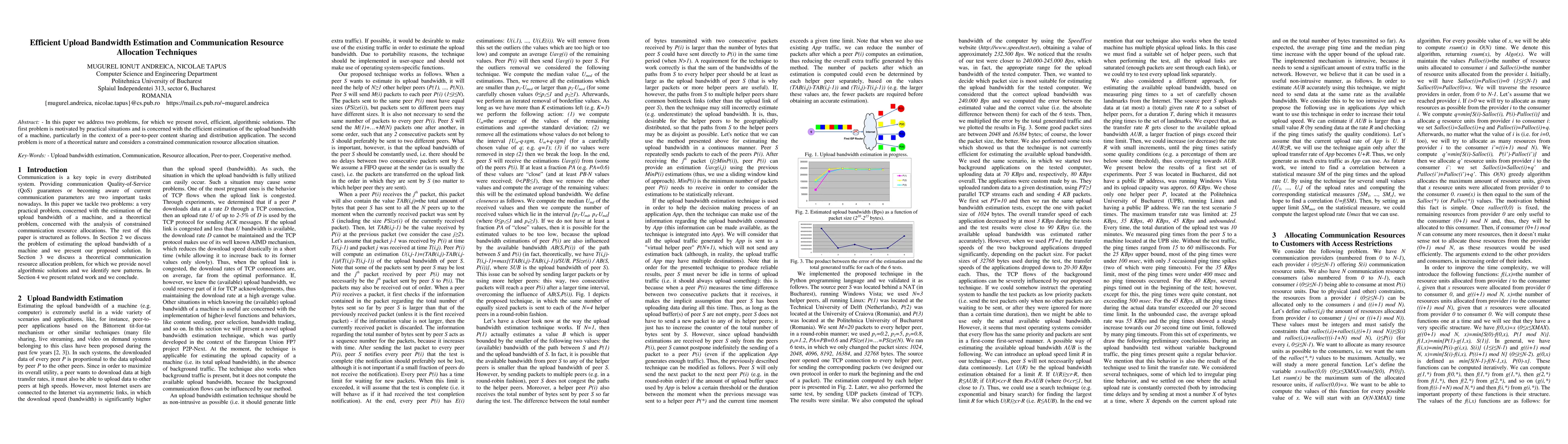 In this paper we address two problems, for which we present novel, efficient, algorithmic solutions. The first problem is motivated by practical situations and is concerned with the efficient estimation of the upload bandwidth of a machine, particularly in the context of a peer-to-peer content sharing and distribution application. The second problem is more of a theoretical nature and considers a constrained communication resource allocation situation.