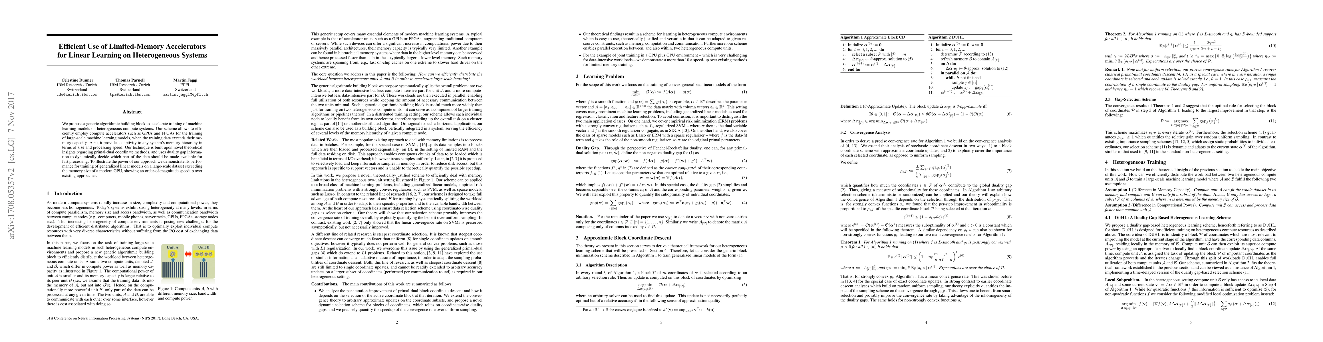 We propose a generic algorithmic building block to accelerate training of machine learning models on heterogeneous compute systems. Our scheme allows to efficiently employ compute accelerators such as GPUs and FPGAs for the training of large-scale machine learning models, when the training data exceeds their memory capacity. Also, it provides adaptivity to any system's memory hierarchy in terms of size and processing speed. Our technique is built upon novel theoretical insights regarding primal-dual coordinate methods, and uses duality gap information to dynamically decide which part of the data should be made available for fast processing. To illustrate the power of our approach we demonstrate its performance for training of generalized linear models on a large-scale dataset exceeding the memory size of a modern GPU, showing an order-of-magnitude speedup over existing approaches.