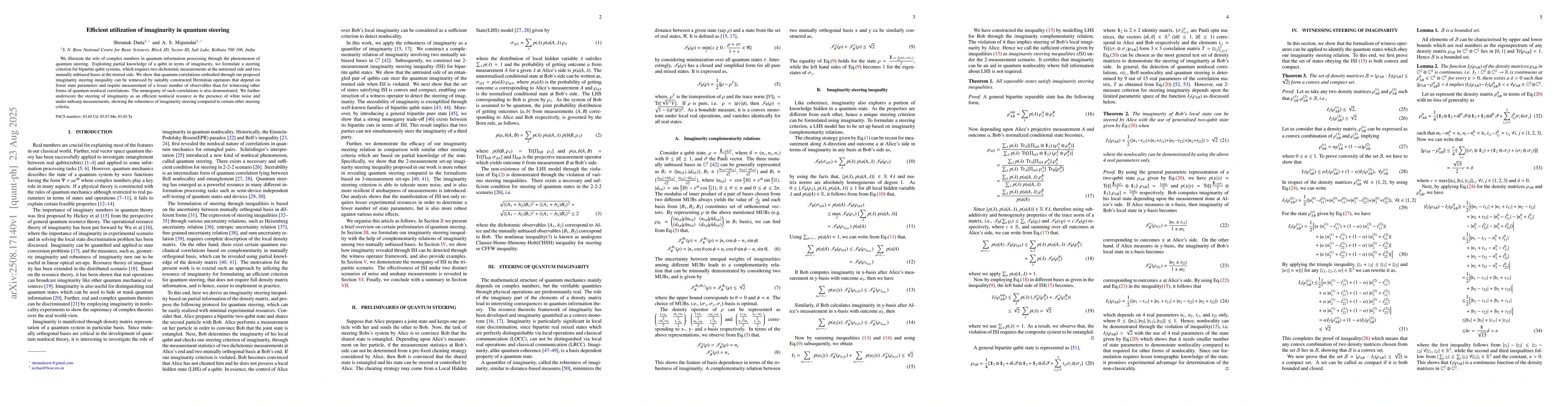 We illustrate the role of complex numbers in quantum information processing through the phenomenon of quantum steering. Exploiting partial knowledge of a qubit in terms of imaginarity, we formulate a steering criterion for bipartite qubit systems, which requires two dichotomic measurements at the untrusted side and two mutually unbiased bases at the trusted side. We show that quantum correlations embodied through our proposed imaginarity steering inequality can be witnessed by suitably constructed Hermitian operators that depend on fewer state parameters and require measurement of a lesser number of observables than for witnessing other forms of quantum nonlocal correlations. The monogamy of such correlations is also demonstrated. We further underscore the steering of imaginarity as an efficient nonlocal resource in the presence of white noise and under unhsarp measurements, showing the robustness of imaginarity steering compared to certain other steering criteria.