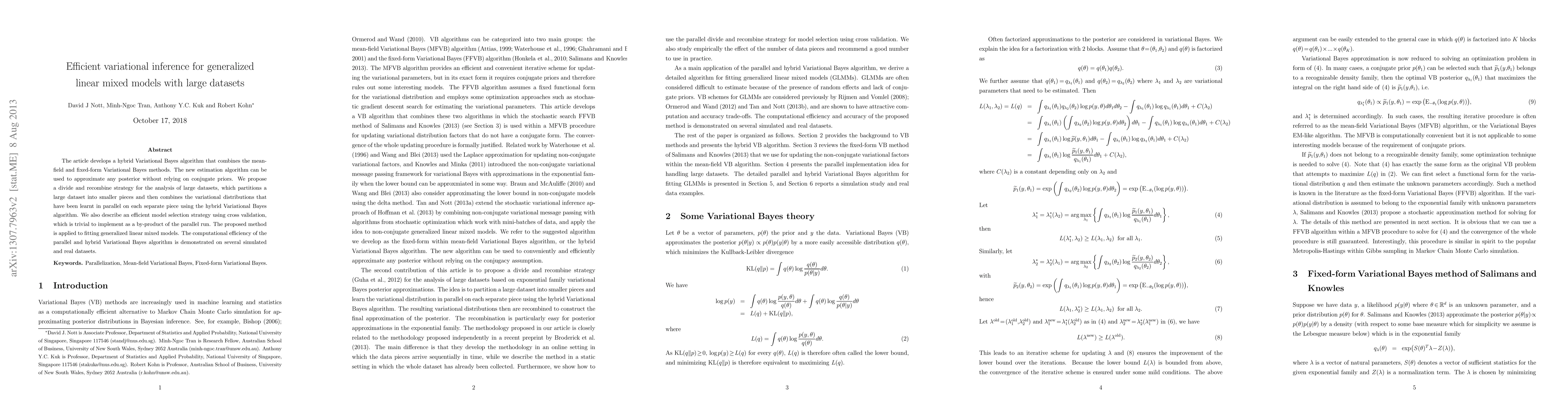 This paper introduces a hybrid Variational Bayes algorithm combining mean-field and fixed-form methods for efficient inference in generalized linear mixed models. It employs a divide and recombine strategy for large datasets, demonstrating computational efficiency through parallel processing on partitioned data.