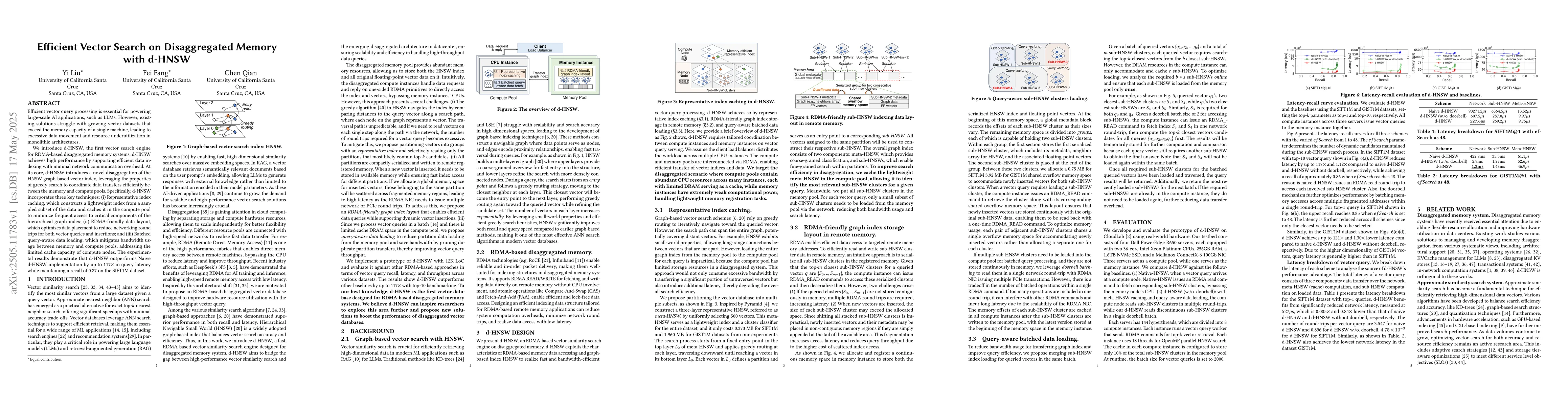 The research presents d-HNSW, a disaggregated vector similarity search engine for RDMA-based remote memory systems, utilizing a disaggregated version of the HNSW indexing data structure with representative index caching, RDMA-friendly data layout, and batched query-aware data loading.