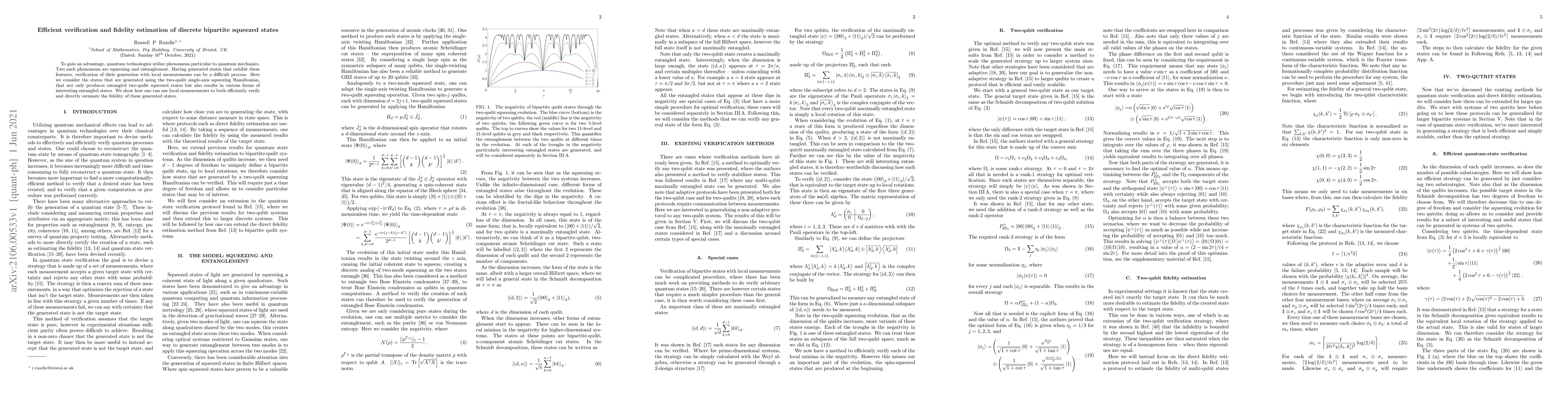 This paper presents a method for efficiently verifying and estimating the fidelity of discrete bipartite squeezed states generated via a two-qudit single-axis squeezing Hamiltonian, utilizing local measurements to achieve these goals.