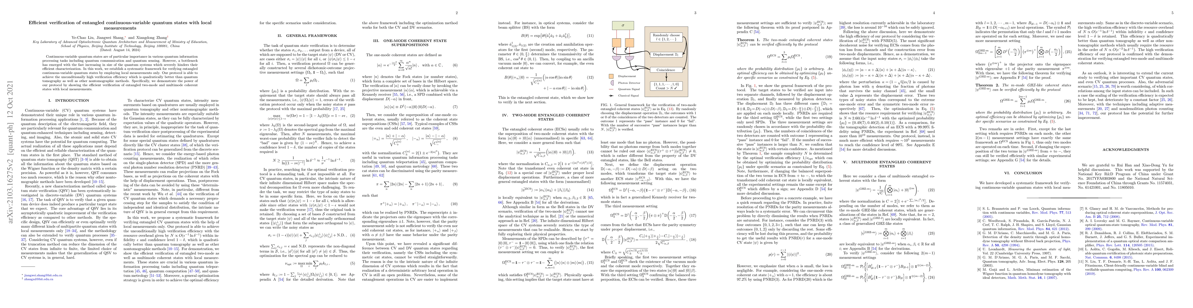 This paper proposes a framework for efficiently verifying entangled continuous-variable quantum states using only local measurements, achieving verification efficiency quadratically superior to quantum tomography and other methods. The protocol is demonstrated for entangled two-mode and multimode coherent states.