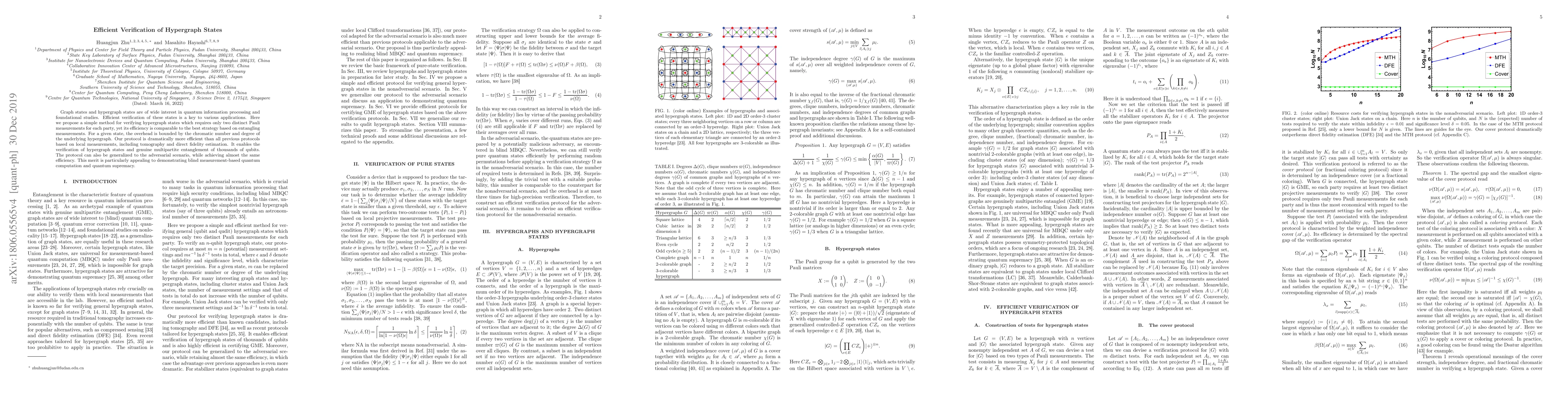 This paper proposes an efficient method for verifying hypergraph states using only two Pauli measurements per party, which is significantly more efficient than previous methods, including tomography. The efficiency is bounded by the hypergraph's chromatic number and degree, and it can be generalized to adversarial scenarios, crucial for demonstrating quantum supremacy.