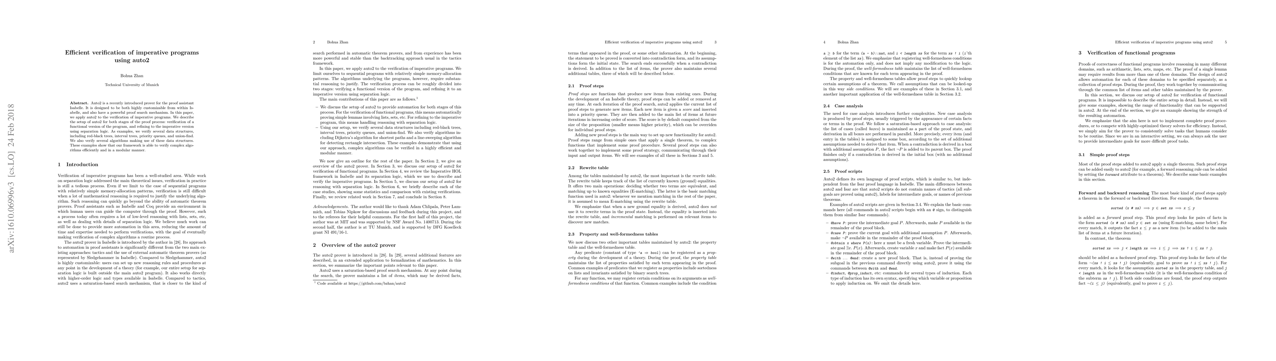 This paper applies the customizable prover auto2 within Isabelle to efficiently verify imperative programs by first verifying functional versions and then refining to imperative versions using separation logic. Examples include verifying data structures like red-black trees and algorithms, demonstrating the framework's efficiency and modularity.