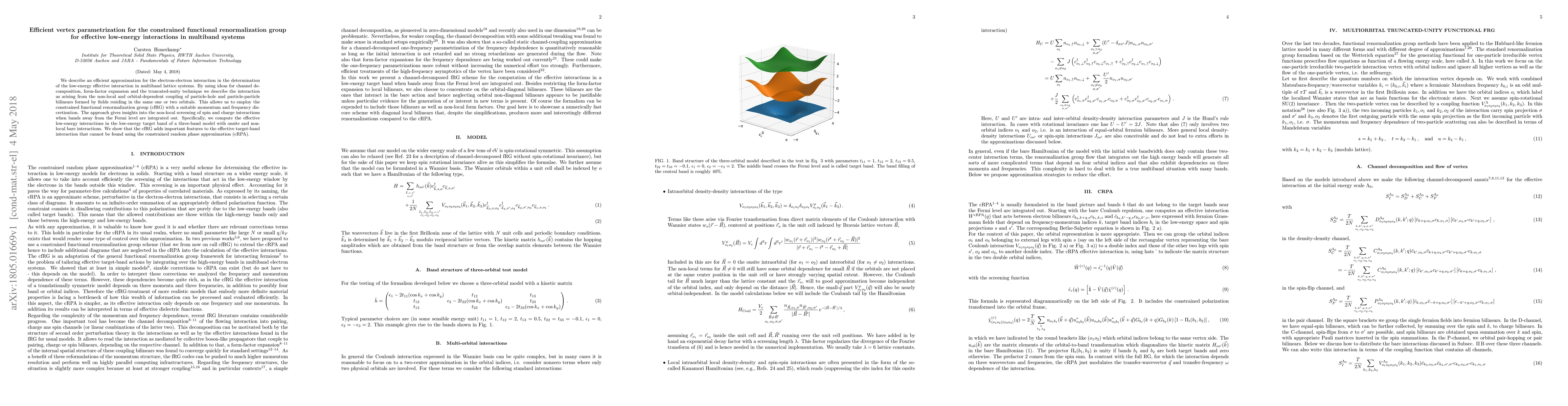 This paper proposes an efficient method for determining low-energy effective interactions in multiband systems using constrained functional renormalization group (cfRG) with vertex parametrization. The approach reveals non-local screening effects in spin and charge interactions, providing a superior description compared to the constrained random phase approximation (cRPA).