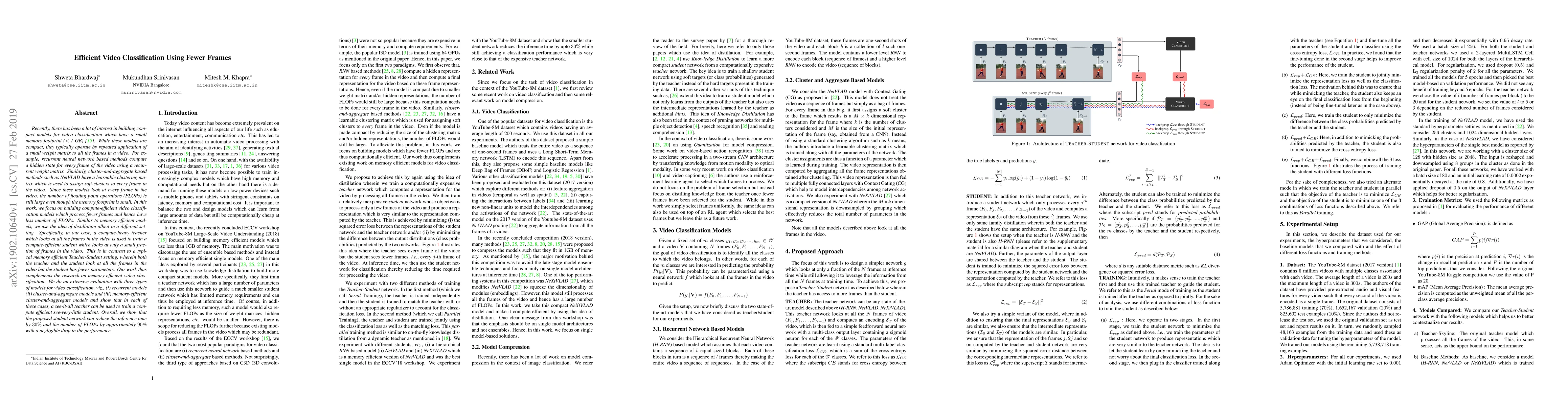 This paper proposes a method to build compute-efficient video classification models that process fewer frames, reducing FLOPs by 90% while maintaining performance. It uses a distillation approach where a teacher model analyzing all frames trains a student model that examines only a small fraction of frames, achieving a 30% reduction in inference time.