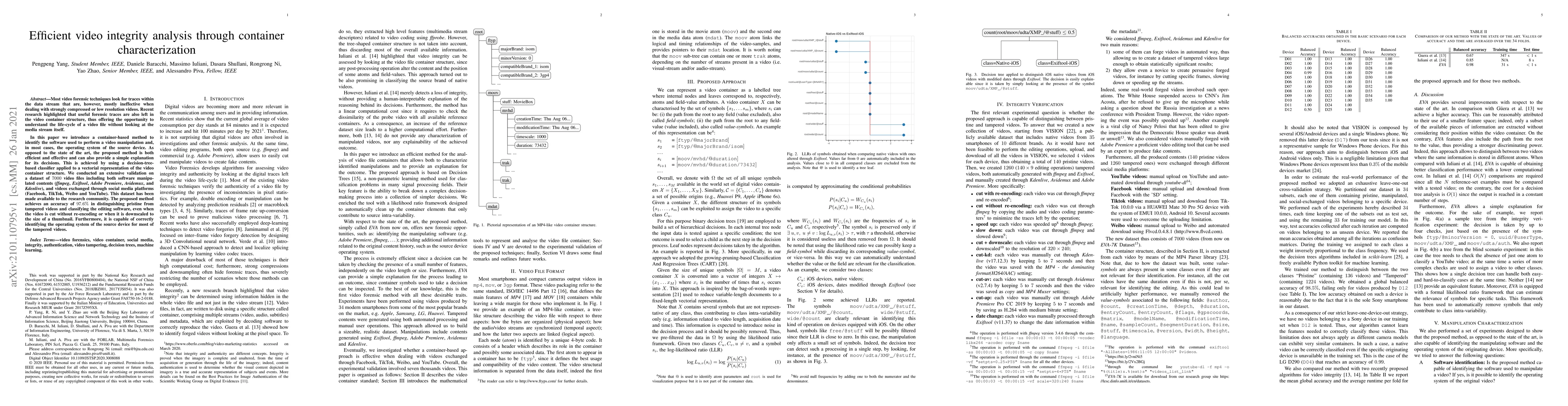 Most video forensic techniques look for traces within the data stream that are, however, mostly ineffective when dealing with strongly compressed or low resolution videos. Recent research highlighted that useful forensic traces are also left in the video container structure, thus offering the opportunity to understand the life-cycle of a video file without looking at the media stream itself. In this paper we introduce a container-based method to identify the software used to perform a video manipulation and, in most cases, the operating system of the source device. As opposed to the state of the art, the proposed method is both efficient and effective and can also provide a simple explanation for its decisions. This is achieved by using a decision-tree-based classifier applied to a vectorial representation of the video container structure. We conducted an extensive validation on a dataset of 7000 video files including both software manipulated contents (ffmpeg, Exiftool, Adobe Premiere, Avidemux, and Kdenlive), and videos exchanged through social media platforms (Facebook, TikTok, Weibo and YouTube). This dataset has been made available to the research community. The proposed method achieves an accuracy of 97.6% in distinguishing pristine from tampered videos and classifying the editing software, even when the video is cut without re-encoding or when it is downscaled to the size of a thumbnail. Furthermore, it is capable of correctly identifying the operating system of the source device for most of the tampered videos.