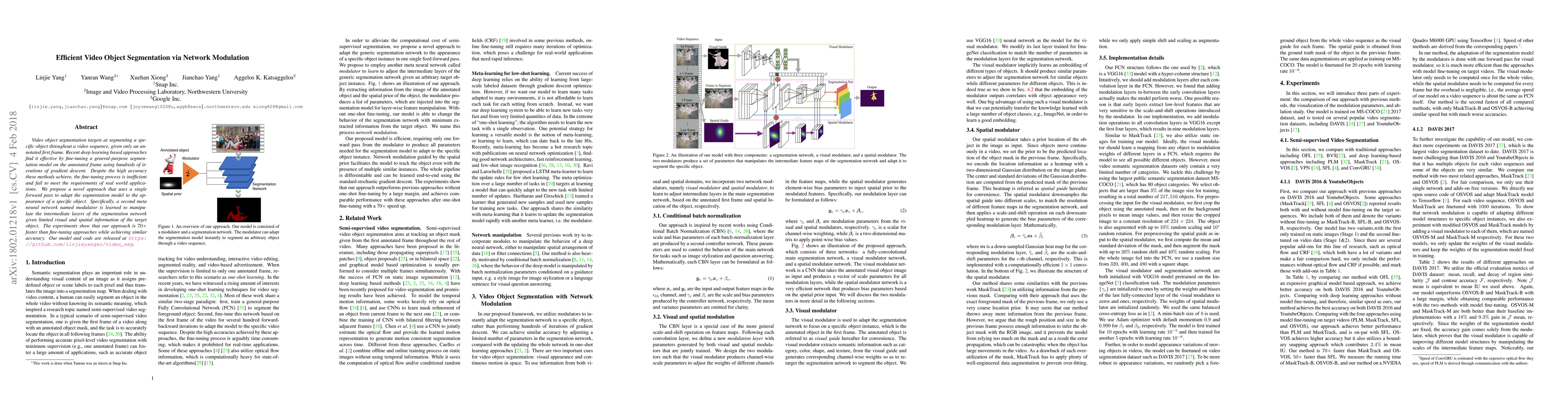 This paper proposes a novel method for efficient video object segmentation using a modulator network that adapts the segmentation model in a single forward pass, achieving similar accuracy but 70 times faster than traditional fine-tuning approaches. The modulator network manipulates the segmentation model's intermediate layers based on limited target object information.