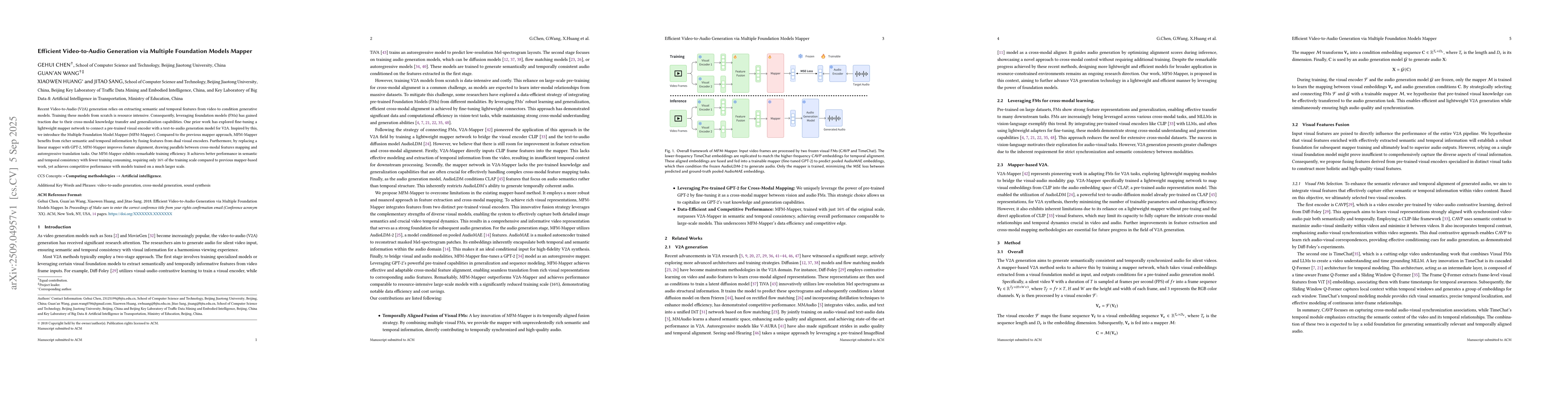 Recent Video-to-Audio (V2A) generation relies on extracting semantic and temporal features from video to condition generative models. Training these models from scratch is resource intensive. Consequently, leveraging foundation models (FMs) has gained traction due to their cross-modal knowledge transfer and generalization capabilities. One prior work has explored fine-tuning a lightweight mapper network to connect a pre-trained visual encoder with a text-to-audio generation model for V2A. Inspired by this, we introduce the Multiple Foundation Model Mapper (MFM-Mapper). Compared to the previous mapper approach, MFM-Mapper benefits from richer semantic and temporal information by fusing features from dual visual encoders. Furthermore, by replacing a linear mapper with GPT-2, MFM-Mapper improves feature alignment, drawing parallels between cross-modal features mapping and autoregressive translation tasks. Our MFM-Mapper exhibits remarkable training efficiency. It achieves better performance in semantic and temporal consistency with fewer training consuming, requiring only 16\% of the training scale compared to previous mapper-based work, yet achieves competitive performance with models trained on a much larger scale.
