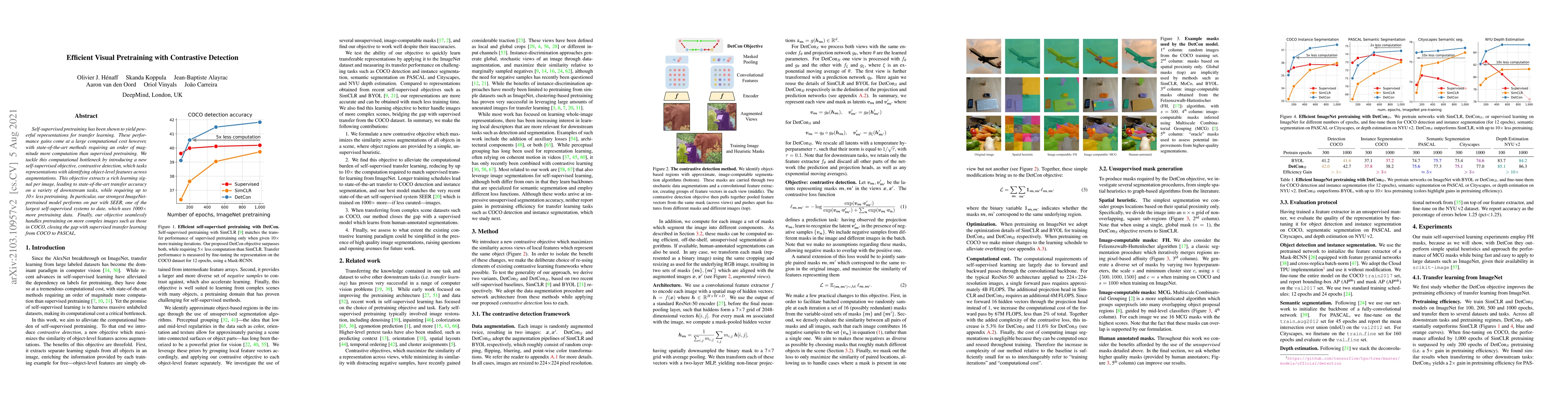 This paper introduces contrastive detection, a self-supervised pretraining method that significantly reduces computational costs while achieving state-of-the-art transfer learning performance, performing comparably to much larger systems using 100 times more pretraining data.