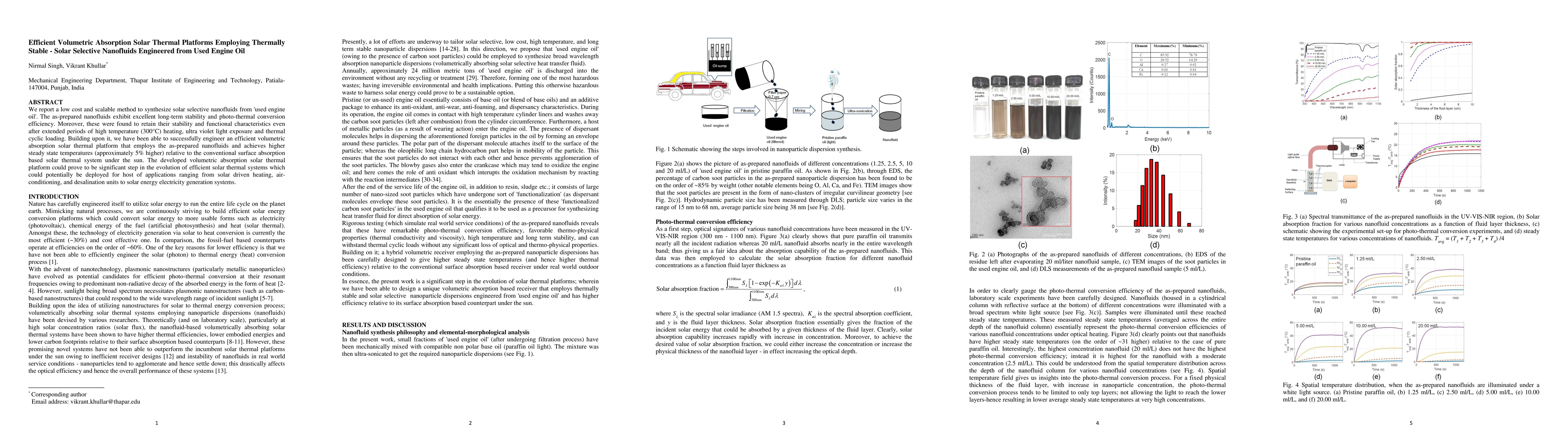 This paper presents a cost-effective method to create thermally stable solar selective nanofluids from used engine oil, demonstrating high photo-thermal efficiency and stability. The engineered volumetric absorption solar thermal platform utilizes these nanofluids to achieve higher steady-state temperatures compared to conventional systems, potentially advancing solar thermal applications.