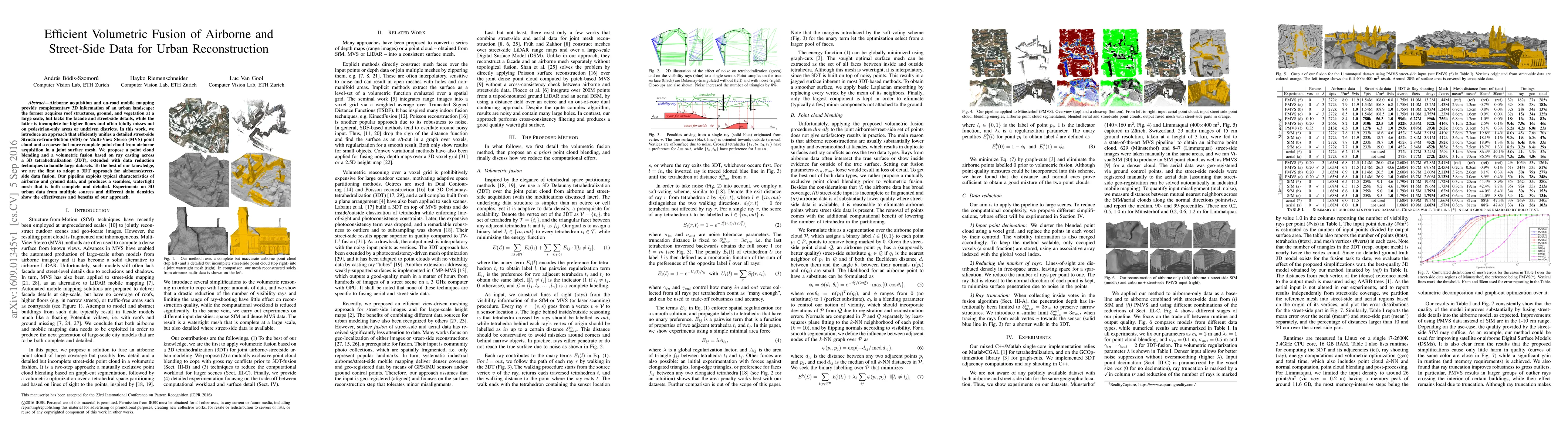 Airborne acquisition and on-road mobile mapping provide complementary 3D information of an urban landscape: the former acquires roof structures, ground, and vegetation at a large scale, but lacks the facade and street-side details, while the latter is incomplete for higher floors and often totally misses out on pedestrian-only areas or undriven districts. In this work, we introduce an approach that efficiently unifies a detailed street-side Structure-from-Motion (SfM) or Multi-View Stereo (MVS) point cloud and a coarser but more complete point cloud from airborne acquisition in a joint surface mesh. We propose a point cloud blending and a volumetric fusion based on ray casting across a 3D tetrahedralization (3DT), extended with data reduction techniques to handle large datasets. To the best of our knowledge, we are the first to adopt a 3DT approach for airborne/street-side data fusion. Our pipeline exploits typical characteristics of airborne and ground data, and produces a seamless, watertight mesh that is both complete and detailed. Experiments on 3D urban data from multiple sources and different data densities show the effectiveness and benefits of our approach.