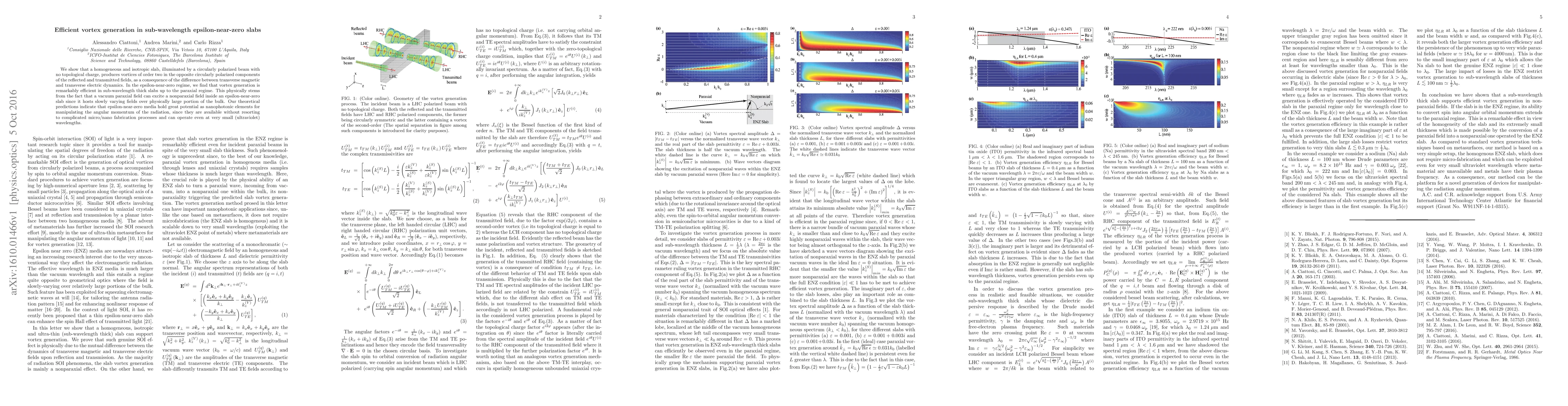 We show that a homogeneous and isotropic slab, illuminated by a circularly polarized beam with no topological charge, produces vortices of order two in the opposite circularly polarized components of the reflected and transmitted fields, as a consequence of the difference between transverse magnetic and transverse electric dynamics. In the epsilon-near-zero regime, we find that vortex generation is remarkably efficient in sub-wavelength thick slabs up to the paraxial regime. This physically stems from the fact that a vacuum paraxial field can excite a nonparaxial field inside an epsilon-near-zero slab since it hosts slowly varying fields over physically large portion of the bulk. Our theoretical predictions indicate that epsilon-near-zero media hold great potential as nanophotonic elements for manipulating the angular momentum of the radiation, since they are available without resorting to complicated micro/nano fabrication processes and can operate even at very small (ultraviolet) wavelengths.