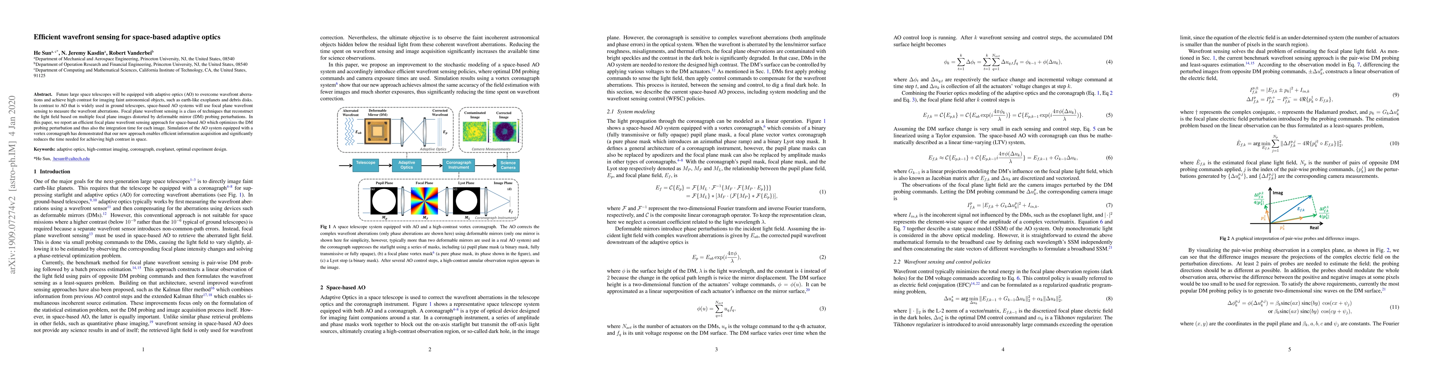 Future large space telescopes will be equipped with adaptive optics (AO) to overcome wavefront aberrations and achieve high contrast for imaging faint astronomical objects, such as earth-like exoplanets and debris disks. In contrast to AO that is widely used in ground telescopes, space-based AO systems will use focal plane wavefront sensing to measure the wavefront aberrations. Focal plane wavefront sensing is a class of techniques that reconstruct the light field based on multiple focal plane images distorted by deformable mirror (DM) probing perturbations. In this paper, we report an efficient focal plane wavefront sensing approach for space-based AO which optimizes the DM probing perturbation and thus also the integration time for each image. Simulation of the AO system equipped with a vortex coronagraph has demonstrated that our new approach enables efficient information acquisition and significantly reduces the time needed for achieving high contrast in space.