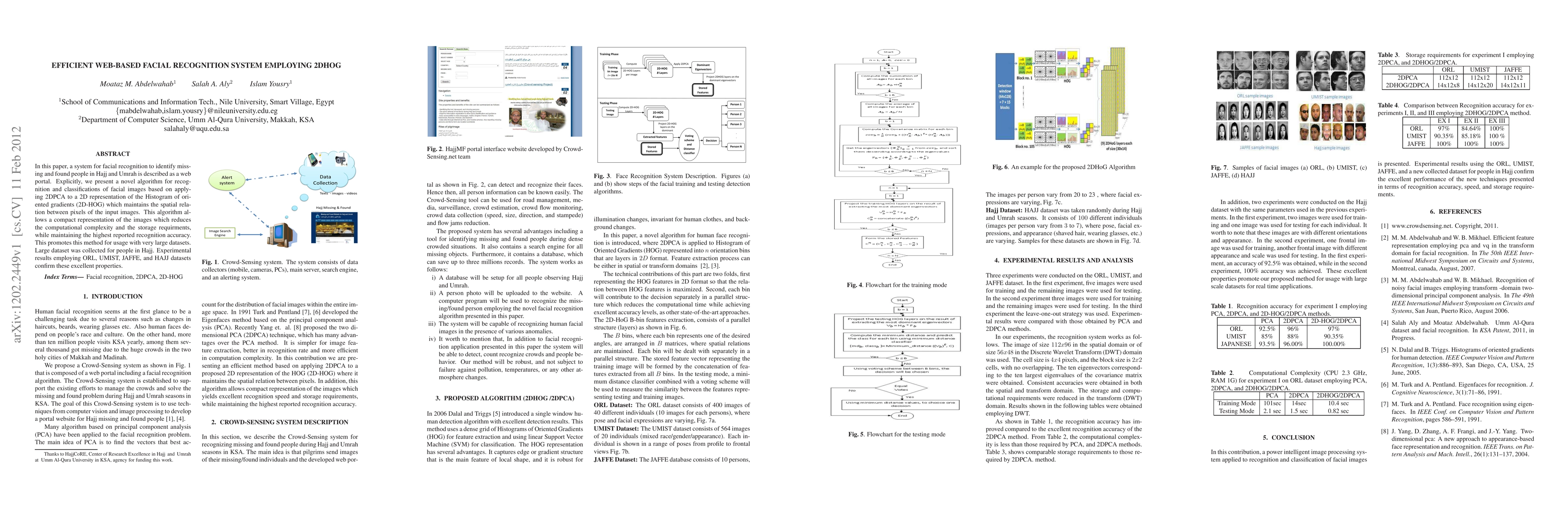 In this paper, a system for facial recognition to identify missing and found people in Hajj and Umrah is described as a web portal. Explicitly, we present a novel algorithm for recognition and classifications of facial images based on applying 2DPCA to a 2D representation of the Histogram of oriented gradients (2D-HOG) which maintains the spatial relation between pixels of the input images. This algorithm allows a compact representation of the images which reduces the computational complexity and the storage requirments, while maintaining the highest reported recognition accuracy. This promotes this method for usage with very large datasets. Large dataset was collected for people in Hajj. Experimental results employing ORL, UMIST, JAFFE, and HAJJ datasets confirm these excellent properties.