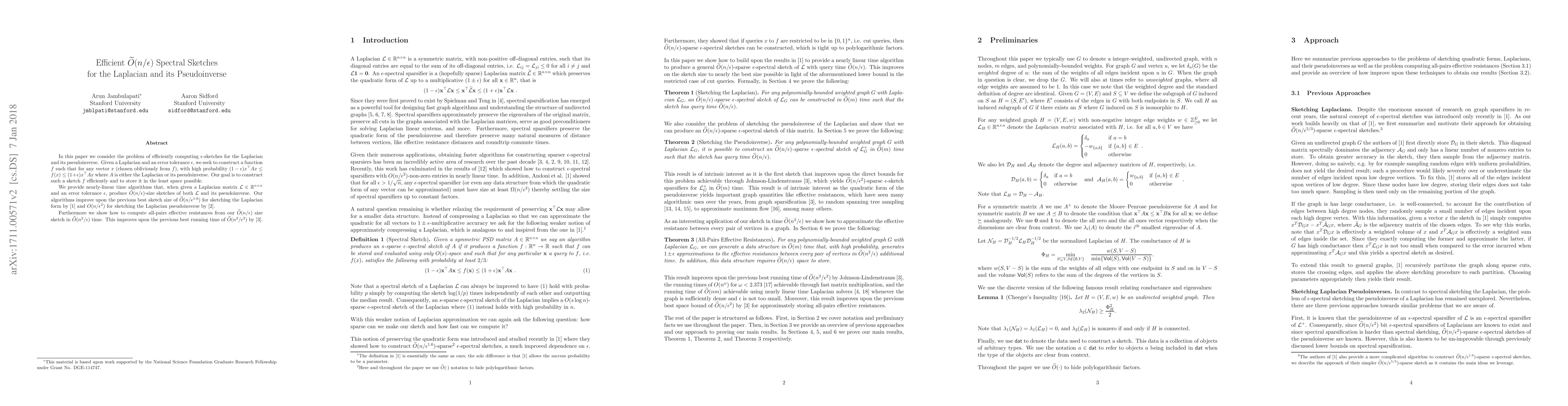 In this paper we consider the problem of efficiently computing $\epsilon$-sketches for the Laplacian and its pseudoinverse. Given a Laplacian and an error tolerance $\epsilon$, we seek to construct a function $f$ such that for any vector $x$ (chosen obliviously from $f$), with high probability $(1-\epsilon) x^\top A x \leq f(x) \leq (1 + \epsilon) x^\top A x$ where $A$ is either the Laplacian or its pseudoinverse. Our goal is to construct such a sketch $f$ efficiently and to store it in the least space possible. We provide nearly-linear time algorithms that, when given a Laplacian matrix $\mathcal{L} \in \mathbb{R}^{n \times n}$ and an error tolerance $\epsilon$, produce $\tilde{O}(n/\epsilon)$-size sketches of both $\mathcal{L}$ and its pseudoinverse. Our algorithms improve upon the previous best sketch size of $\widetilde{O}(n / \epsilon^{1.6})$ for sketching the Laplacian form by Andoni et al (2015) and $O(n / \epsilon^2)$ for sketching the Laplacian pseudoinverse by Batson, Spielman, and Srivastava (2008). Furthermore we show how to compute all-pairs effective resistances from $\widetilde{O}(n/\epsilon)$ size sketch in $\widetilde{O}(n^2/\epsilon)$ time. This improves upon the previous best running time of $\widetilde{O}(n^2/\epsilon^2)$ by Spielman and Srivastava (2008).