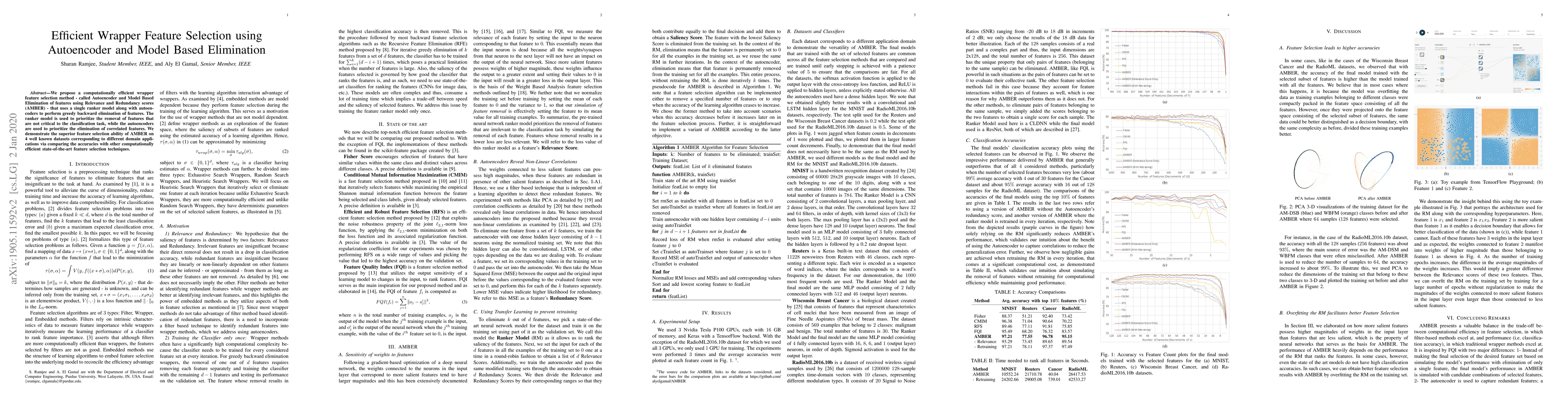 This paper introduces AMBER, a computationally efficient wrapper feature selection method combining a ranker model and autoencoders for greedy feature elimination. The method prioritizes the removal of irrelevant and correlated features, demonstrating superior performance on various datasets compared to other state-of-the-art techniques.