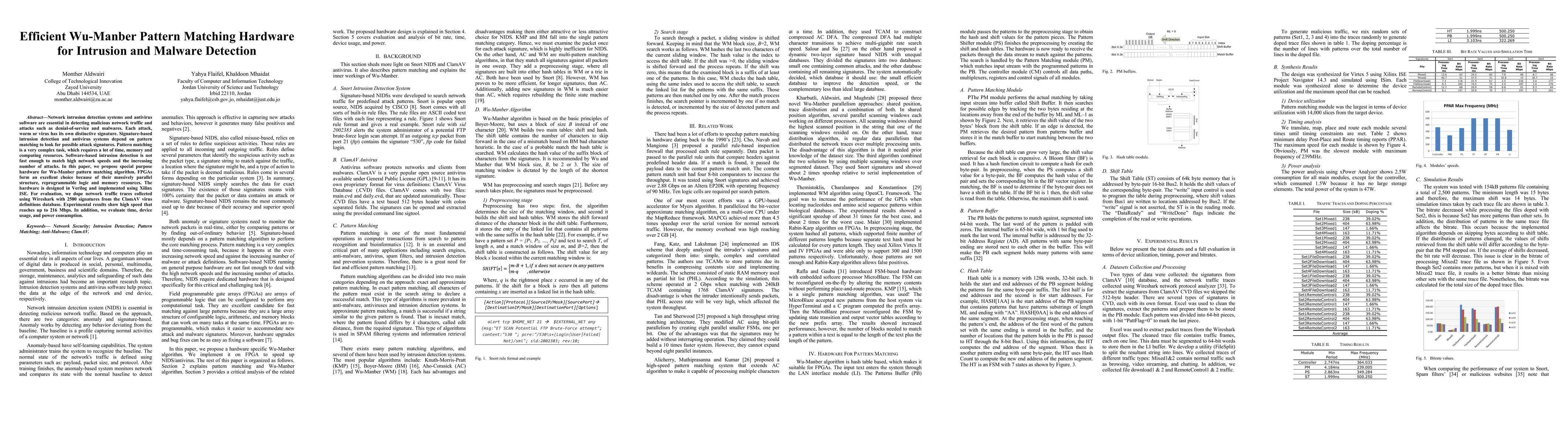 This paper proposes specialized hardware for the Wu-Manber pattern matching algorithm to enhance network intrusion detection and malware detection. The FPGA-based hardware achieves high-speed matching of attack signatures, reaching up to 216 Mbps, addressing the limitations of software-based detection systems.
