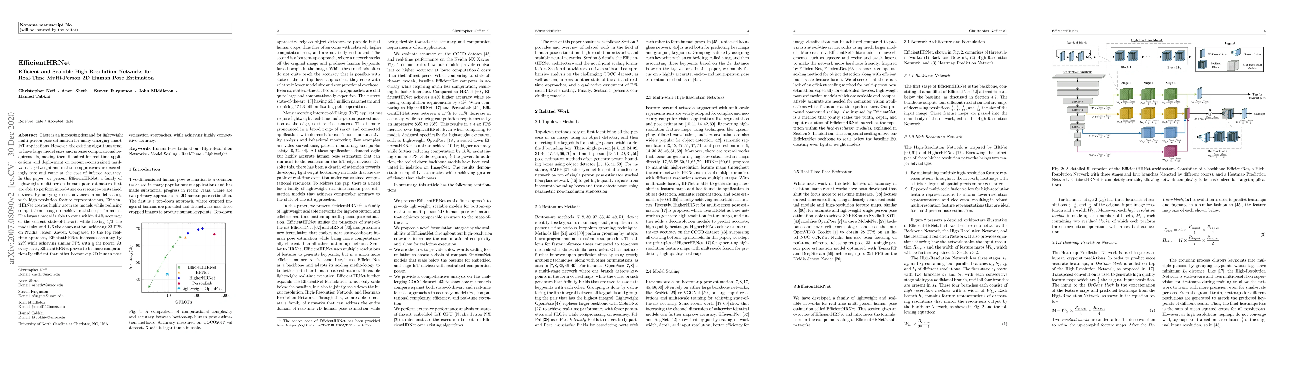 EfficientHRNet presents a family of lightweight multi-person pose estimators that achieve real-time performance on resource-constrained devices, balancing high accuracy with reduced computation and model size. The largest model achieves 95.6% accuracy, 23 FPS on Nvidia Jetson Xavier, and is 1/3 the size and 1/6 the computation of the current state-of-the-art.