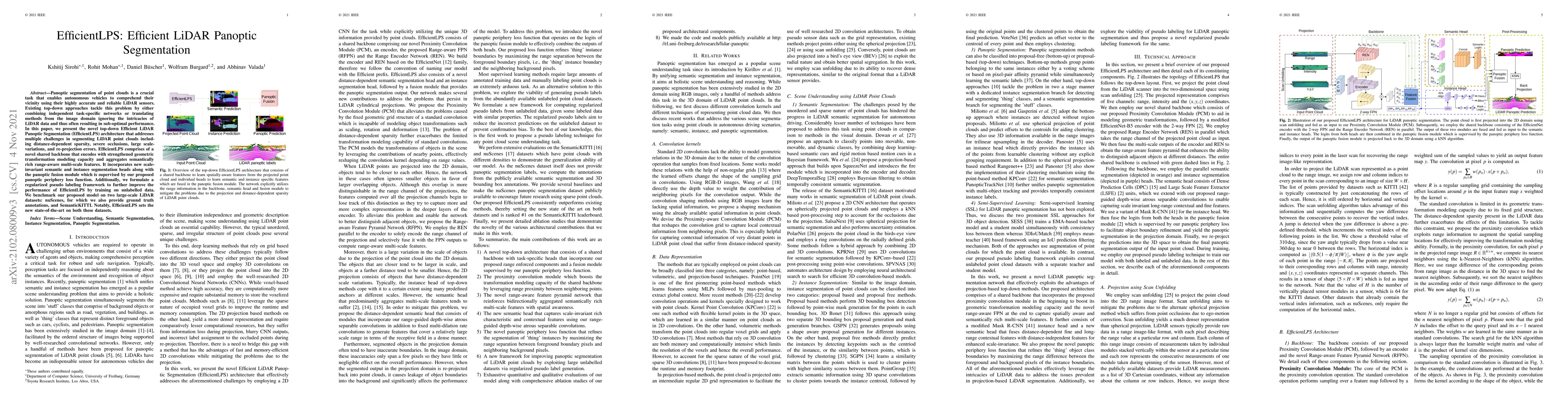 The EfficientLPS architecture presents a novel top-down approach for LiDAR panoptic segmentation, addressing challenges like sparsity and occlusions, and achieving state-of-the-art performance on nuScenes and SemanticKITTI datasets through a shared backbone and panoptic fusion module.