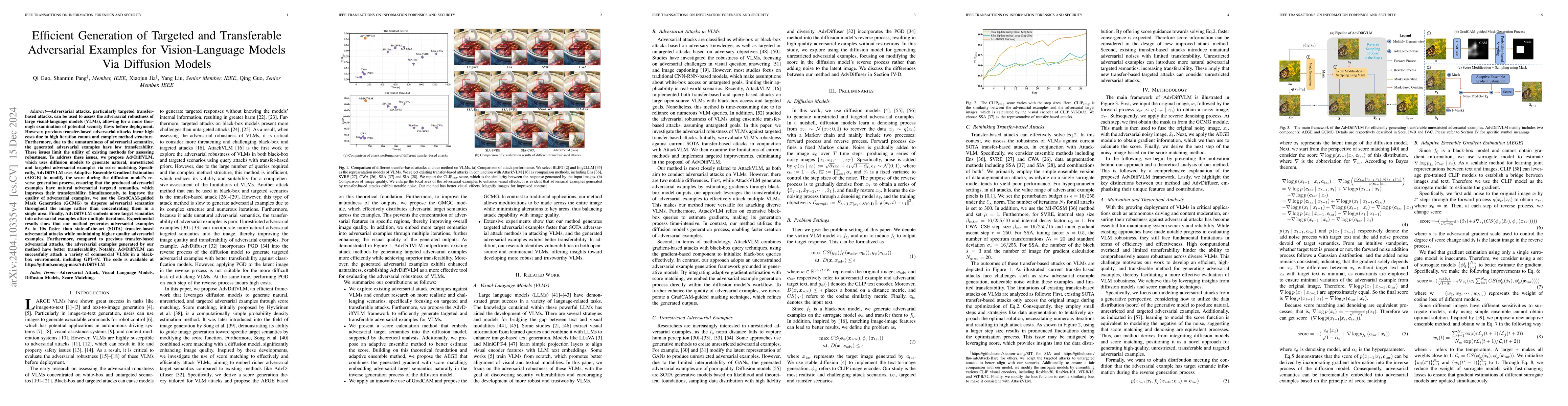 This paper introduces AdvDiffVLM, a novel method for generating efficient adversarial examples for visual-language models using diffusion models, which achieves a significant speedup over existing methods while maintaining high-quality, transferable adversarial attacks that are robust against defense mechanisms.
