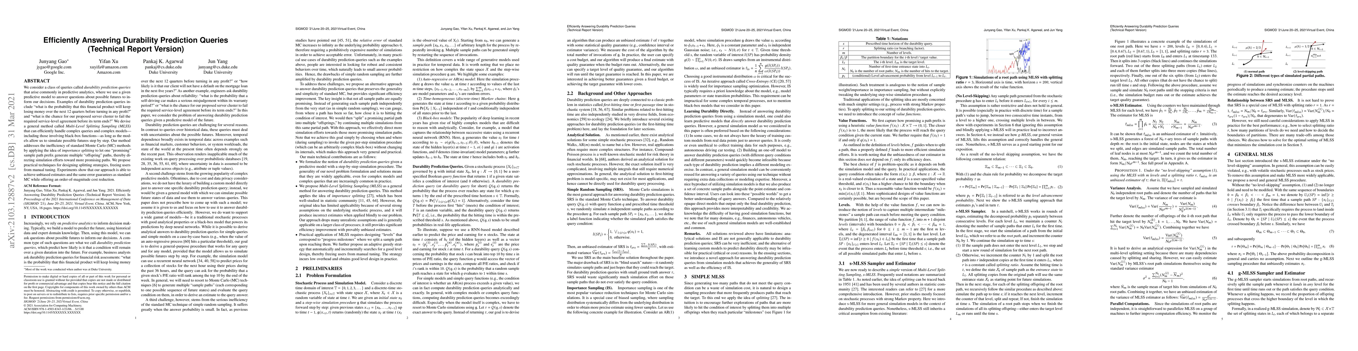 The research introduces Multi-Level Splitting Sampling (MLSS), a method for efficiently answering durability prediction queries, which are common in predictive analytics. MLSS improves upon standard Monte Carlo methods by focusing computational resources on more promising paths, achieving unbiased estimates with lower costs and the same error guarantees.