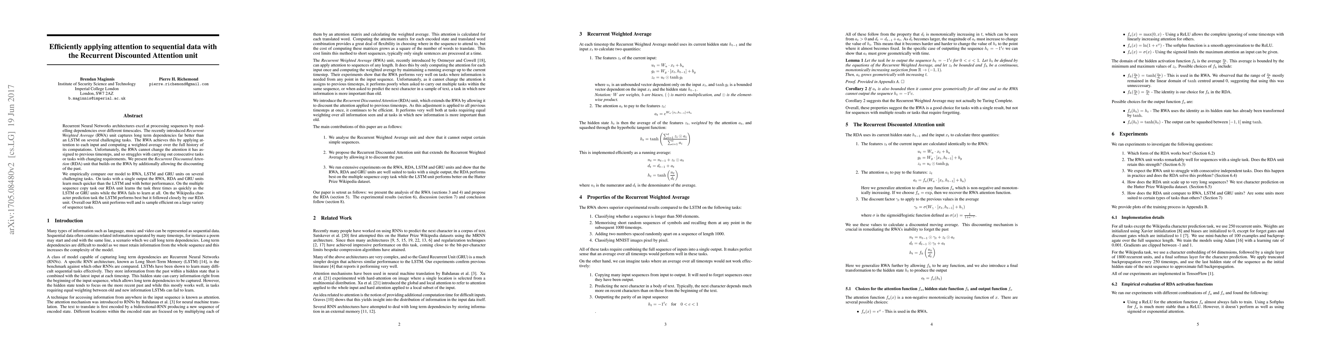 This paper introduces the Recurrent Discounted Attention (RDA) unit, which enhances the Recurrent Weighted Average (RWA) unit by allowing the discounting of past attentions, thus improving performance on tasks requiring changing requirements. Empirical results show that RDA outperforms LSTM and GRU units on various sequence tasks, especially in learning speed and efficiency.