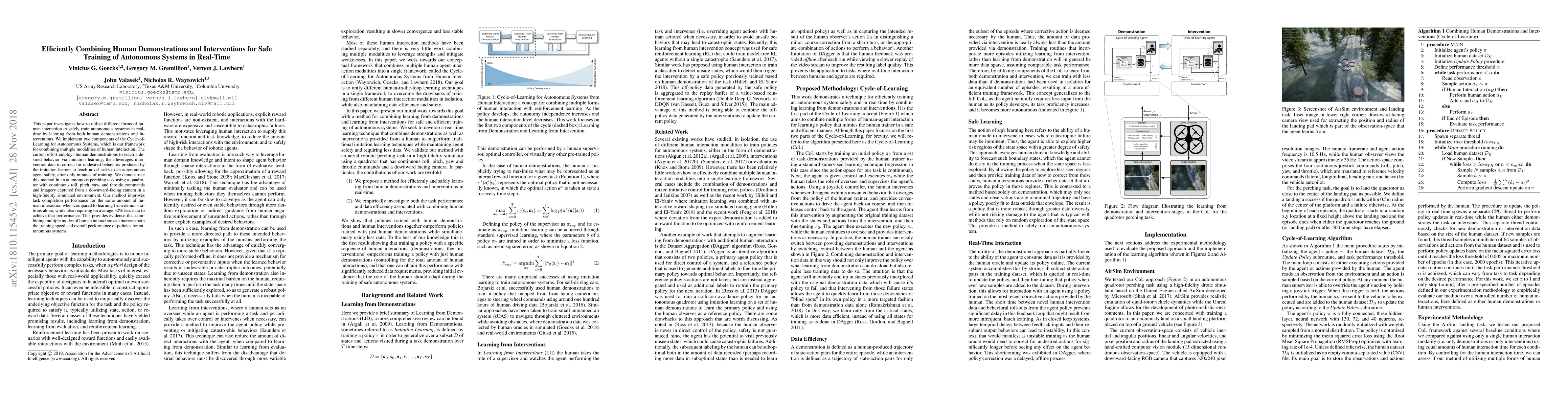This paper investigates how to utilize different forms of human interaction to safely train autonomous systems in real-time by learning from both human demonstrations and interventions. We implement two components of the Cycle-of-Learning for Autonomous Systems, which is our framework for combining multiple modalities of human interaction. The current effort employs human demonstrations to teach a desired behavior via imitation learning, then leverages intervention data to correct for undesired behaviors produced by the imitation learner to teach novel tasks to an autonomous agent safely, after only minutes of training. We demonstrate this method in an autonomous perching task using a quadrotor with continuous roll, pitch, yaw, and throttle commands and imagery captured from a downward-facing camera in a high-fidelity simulated environment. Our method improves task completion performance for the same amount of human interaction when compared to learning from demonstrations alone, while also requiring on average 32% less data to achieve that performance. This provides evidence that combining multiple modes of human interaction can increase both the training speed and overall performance of policies for autonomous systems.