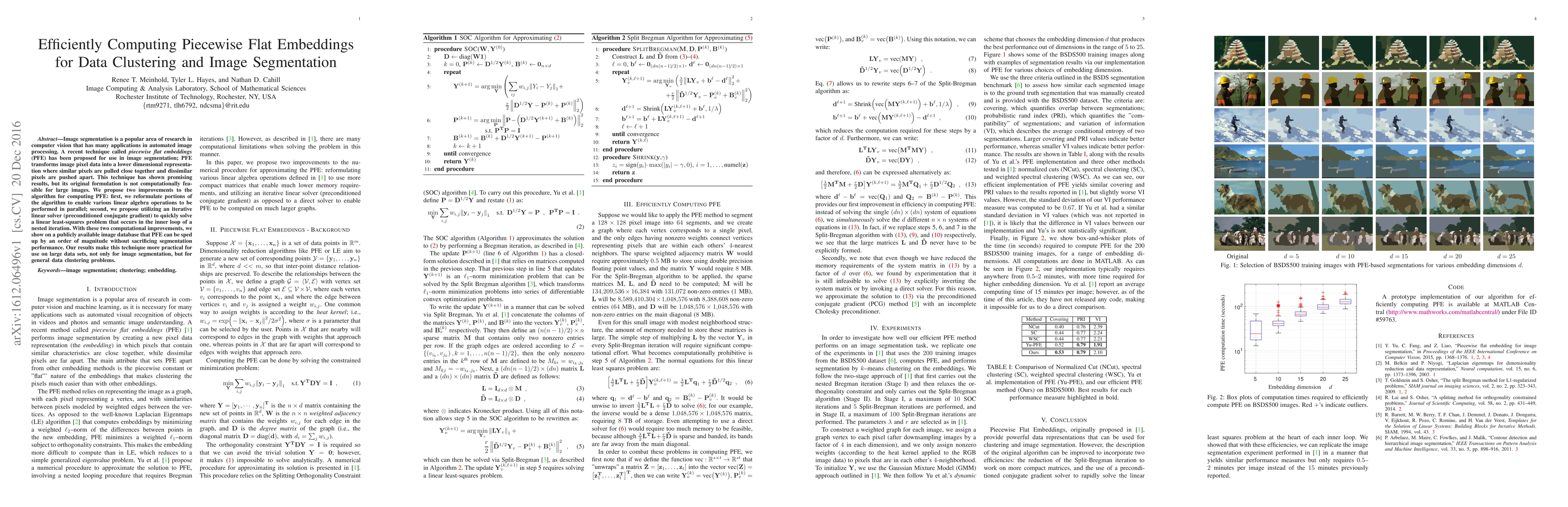 Image segmentation is a popular area of research in computer vision that has many applications in automated image processing. A recent technique called piecewise flat embeddings (PFE) has been proposed for use in image segmentation; PFE transforms image pixel data into a lower dimensional representation where similar pixels are pulled close together and dissimilar pixels are pushed apart. This technique has shown promising results, but its original formulation is not computationally feasible for large images. We propose two improvements to the algorithm for computing PFE: first, we reformulate portions of the algorithm to enable various linear algebra operations to be performed in parallel; second, we propose utilizing an iterative linear solver (preconditioned conjugate gradient) to quickly solve a linear least-squares problem that occurs in the inner loop of a nested iteration. With these two computational improvements, we show on a publicly available image database that PFE can be sped up by an order of magnitude without sacrificing segmentation performance. Our results make this technique more practical for use on large data sets, not only for image segmentation, but for general data clustering problems.