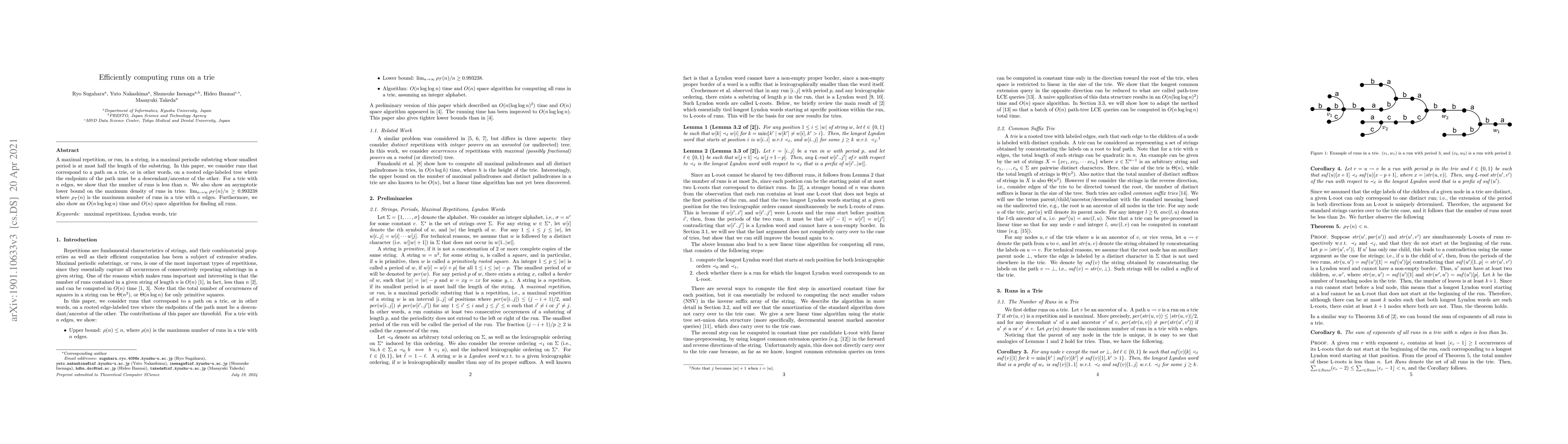 This paper investigates maximal repetitions, or runs, in strings that correspond to paths on a trie, demonstrating that the number of such runs is less than the number of trie edges. It presents an efficient $O(n\log \log n)$ time and $O(n)$ space algorithm for finding all runs and establishes an asymptotic lower bound on the maximum density of runs in tries.