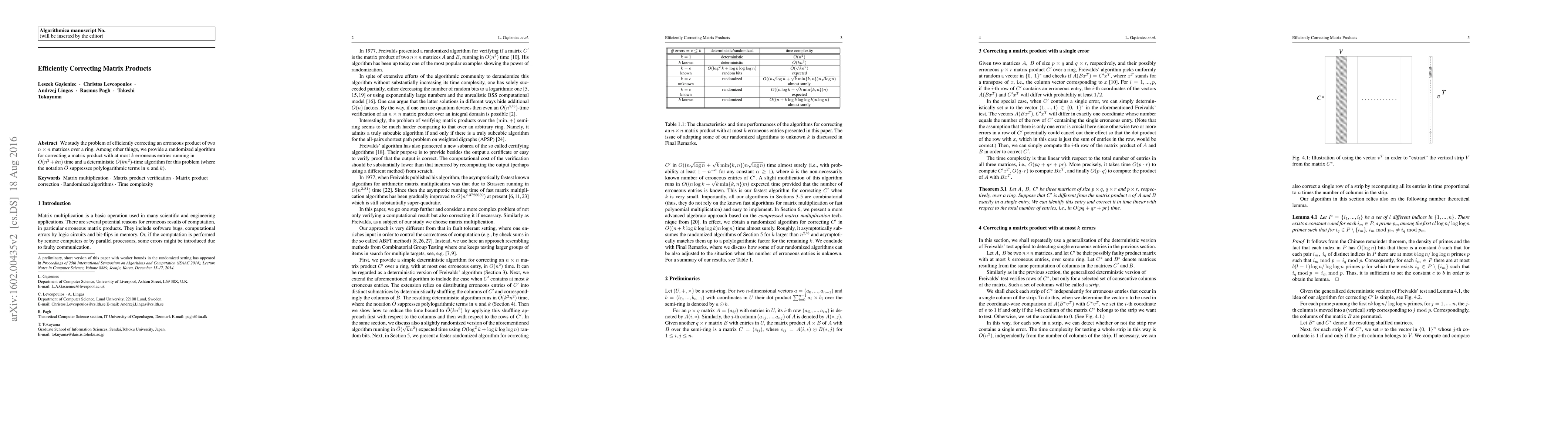 Researchers developed efficient algorithms to correct matrix products with a limited number of erroneous entries, achieving time complexities of O(n^2 + kn) for randomized corrections and O(kn^2) for deterministic corrections.