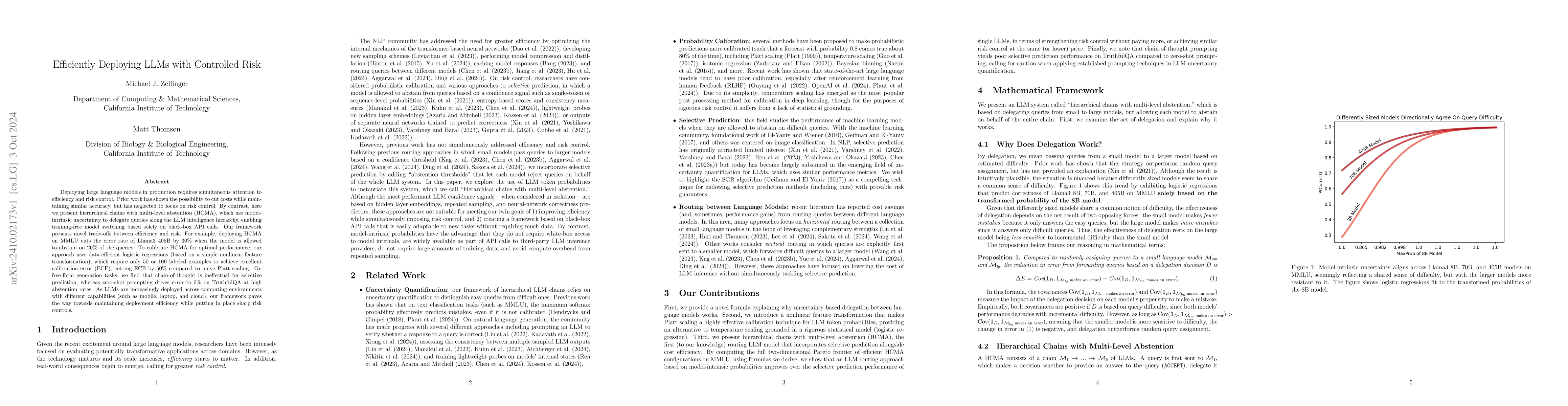 This paper introduces hierarchical chains with multi-level abstention (HCMA) to deploy large language models efficiently while controlling risk. HCMA leverages model-intrinsic uncertainty for query delegation, achieving a 30% reduction in error rates without retraining, and uses data-efficient logistic regressions for calibration with minimal labeled examples.
